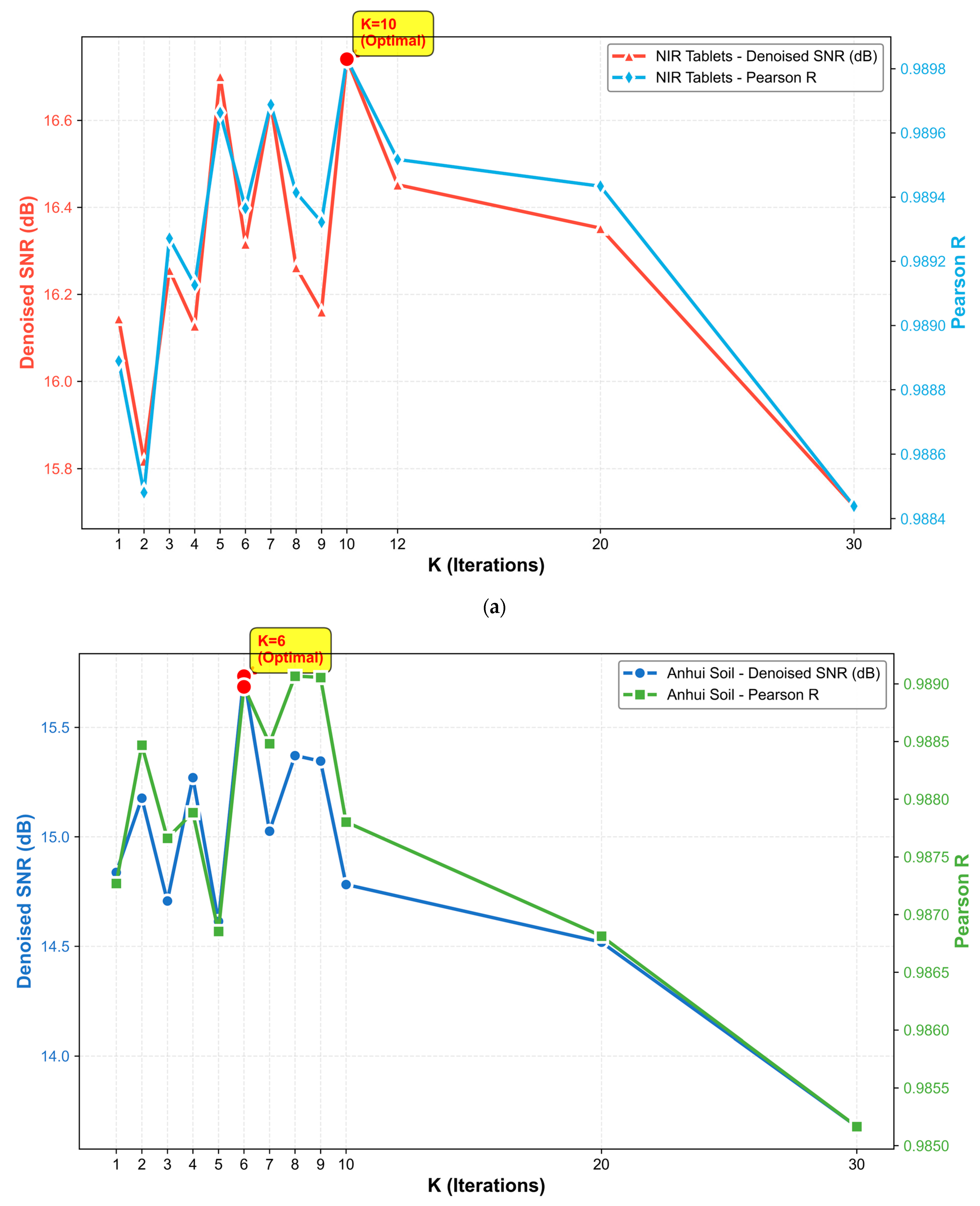 For the Tablet dataset, the model achieves optimal performance at K = 10, where the denoised SNR reaches its maximum and the Pearson R is also near its peak. Beyond this point, an increase in the number of iterations led to degradation. This suggests that moderate refinement helps recover the local spectral features of pharmaceutical samples (e.g., water-related or functional group absorption peaks), whereas excessive iterations introduce oversmoothing, thereby attenuating subtle yet meaningful spectral structures.