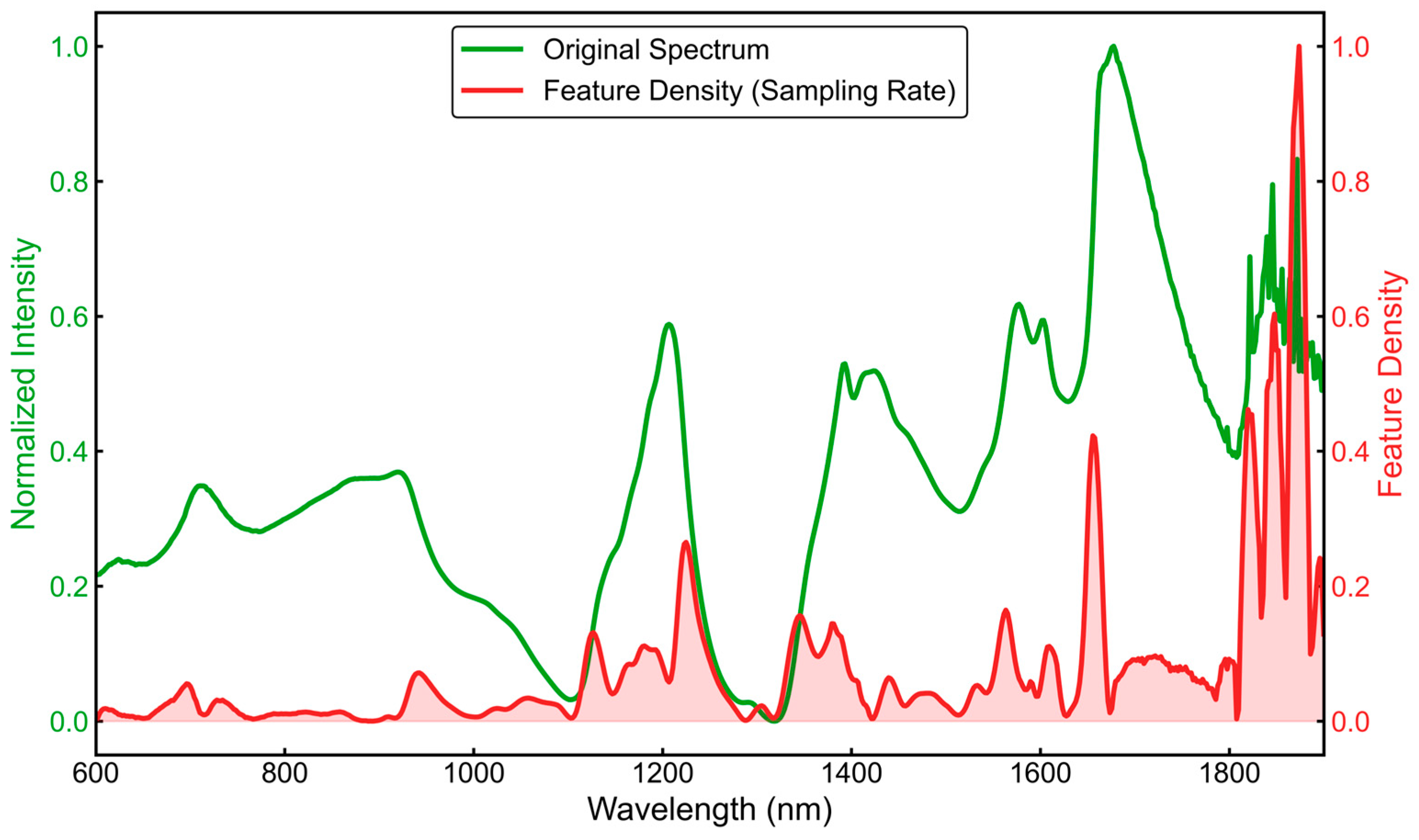 Figure 7, we visualized the feature activation intensity of the local extraction branch (convolutional layers) and compared it with the averaged input spectrum. The results indicated that the feature sampling density was strongly correlated with the amplitudes of the spectral peaks. This suggests that the model automatically “focused” on peak-dense regions, thereby achieving an implicit form of adaptive spectral processing.