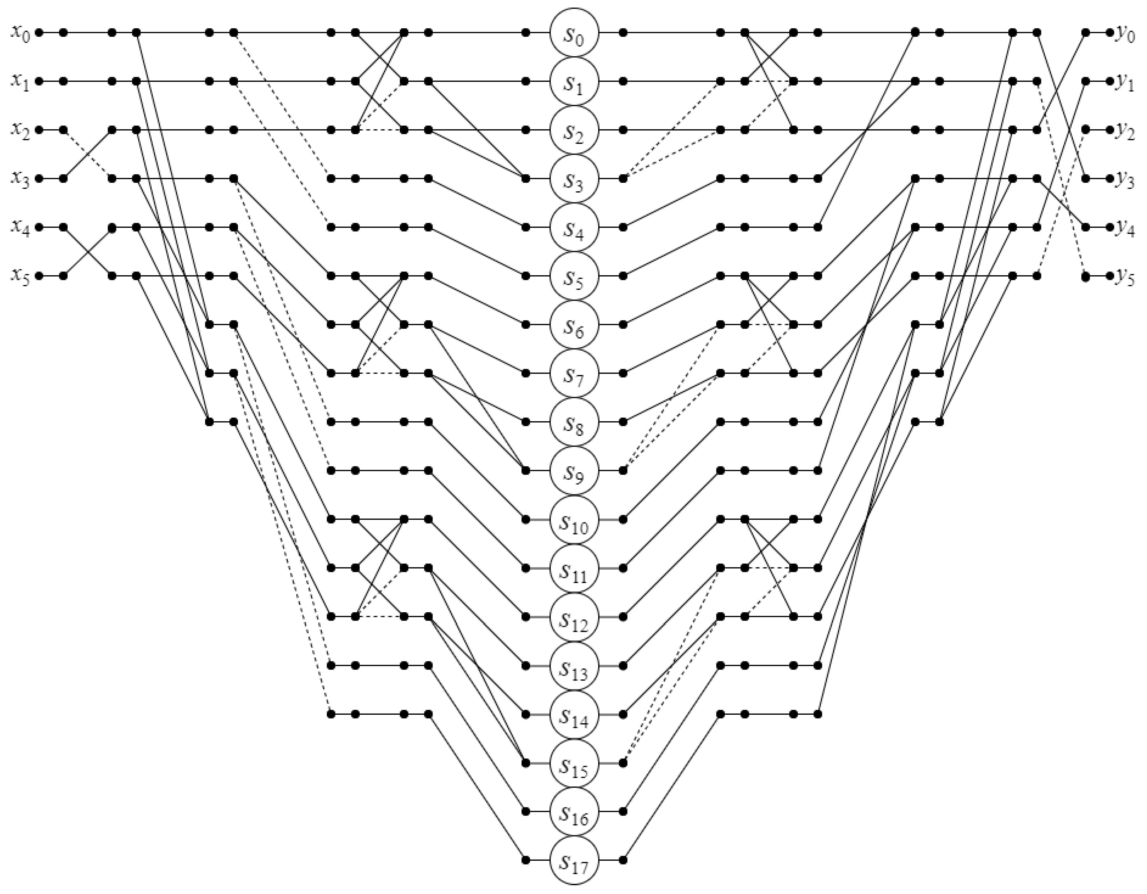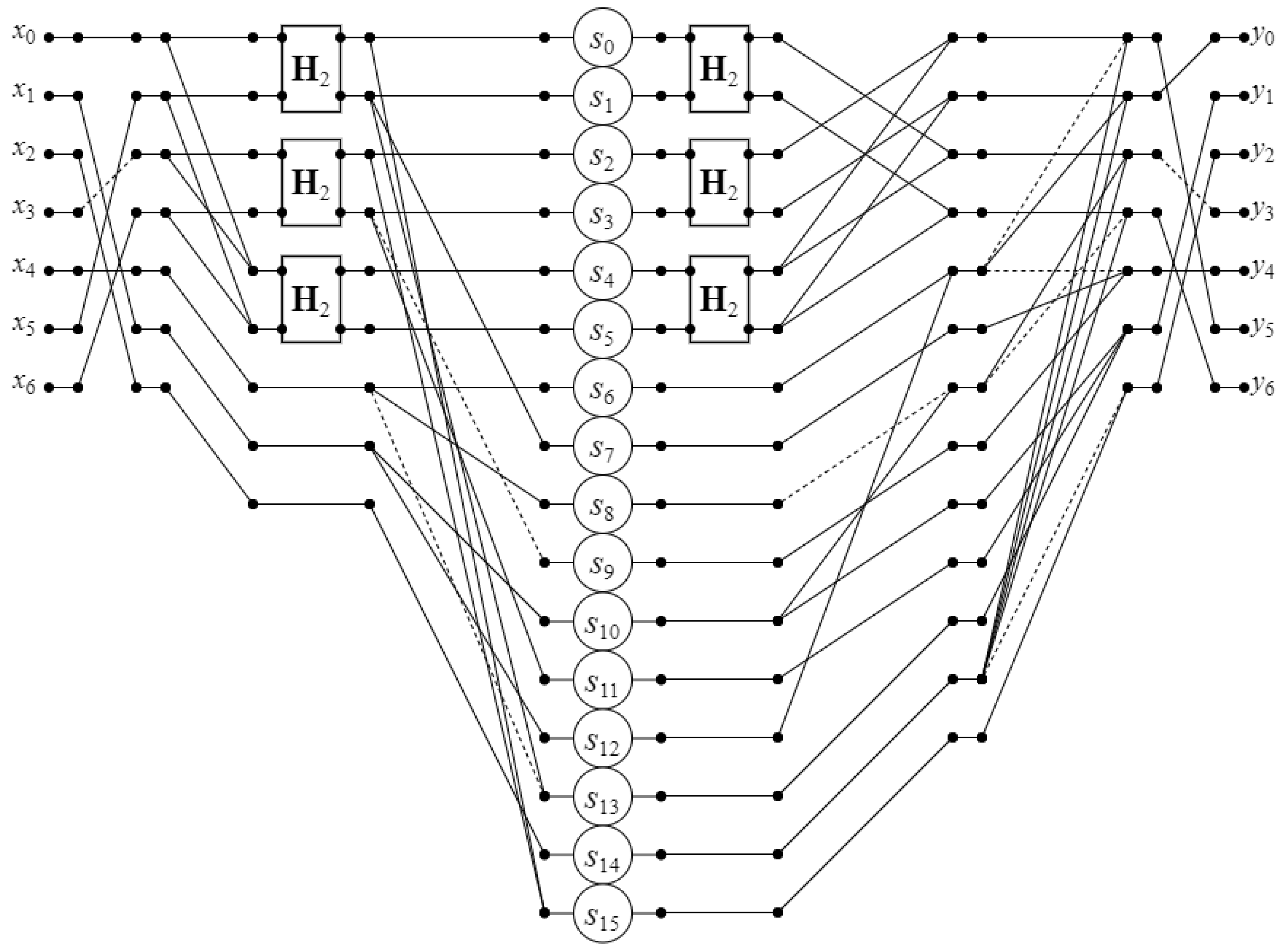 Values of an input vertex are placed on the left side of the graph, while output values appear on the right. Solid lines indicate data flow, and dashed lines indicate data flow with a sign change. Rectangular blocks labeled represent Hadamard matrices, and circles represent multipliers.