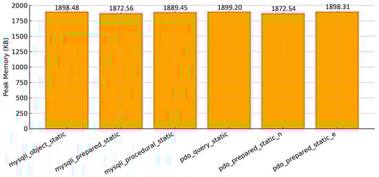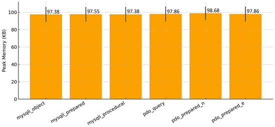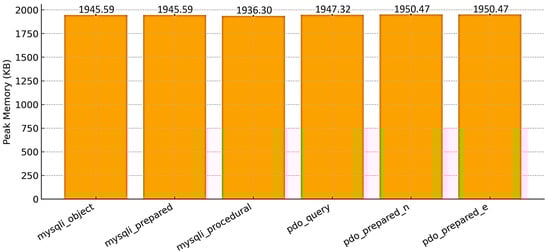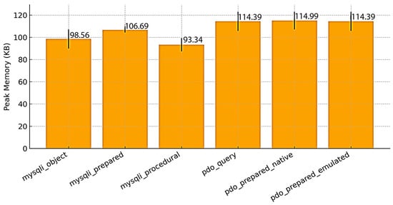 The consistently lower memory footprint of MySQLi-based approaches can be linked to their comparatively lean abstraction layer and tighter coupling with the MySQL protocol. MySQLi exposes result sets and statement objects with less internal indirection, while PDO introduces additional layers to support database portability, generic parameter binding, and unified error handling. These design choices improve flexibility and maintainability but increase the size and lifetime of internal data structures. Consequently, the observed memory-efficiency differences reflect deliberate trade-offs in API design rather than implementation inefficiencies.