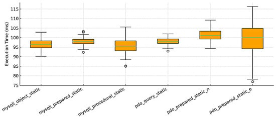 From a systems-level perspective, the lower variability observed for PDO_prepared_e can be interpreted as a consequence of its simplified interaction with the MySQL server. In emulated prepared statement mode, query construction, parameter substitution, and error handling are performed entirely on the PHP side, resulting in a single text-based protocol exchange per execution. This reduces the number of protocol round-trips and avoids server-side state management associated with prepared execution plans. By contrast, native prepared statements require additional protocol interactions for statement preparation, metadata handling, and execution, which may increase variability under complex queries or frequent connection churn. Although internal protocol states were not instrumented in this study, the observed stability patterns are consistent with these known differences in client–server interaction design.