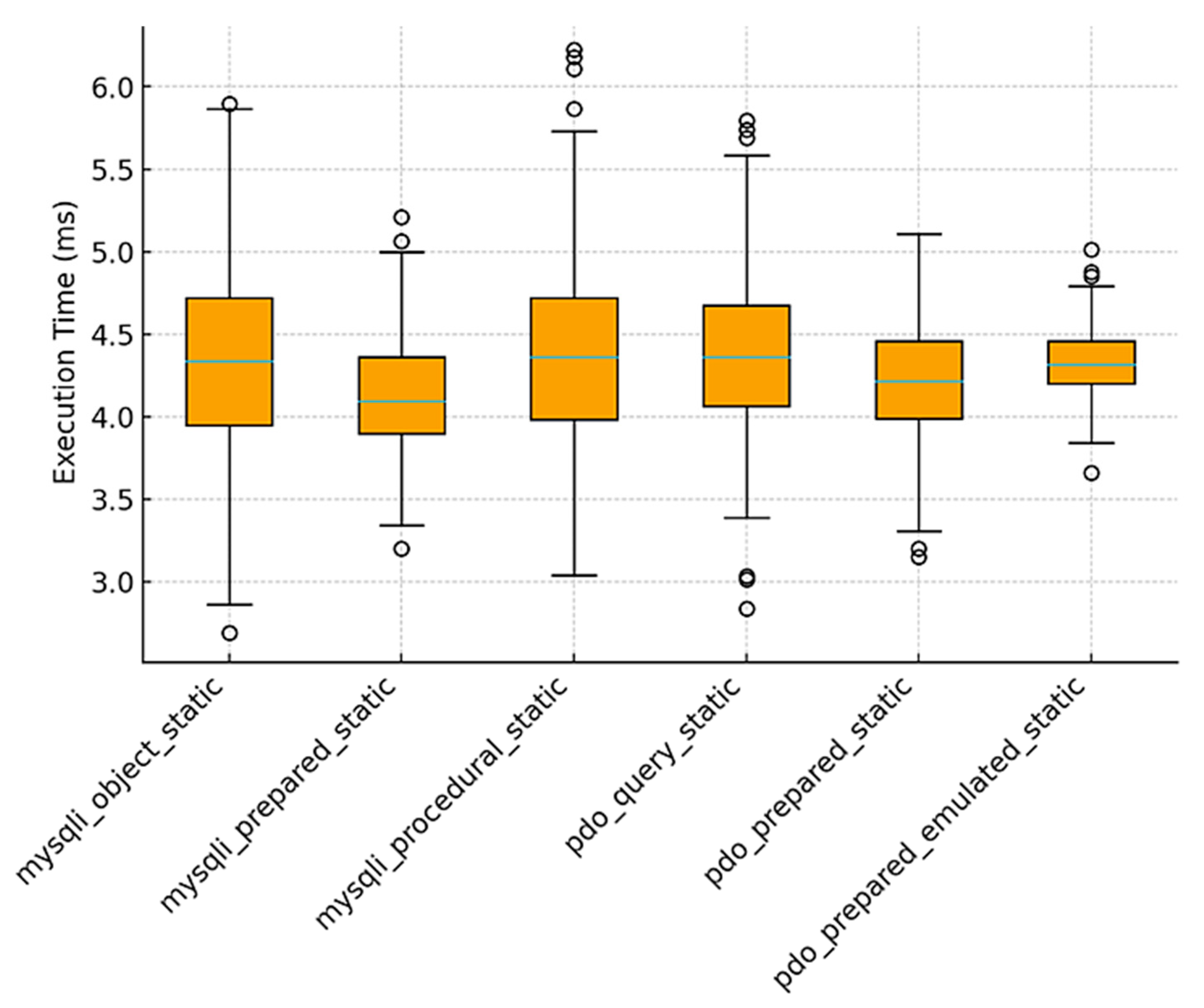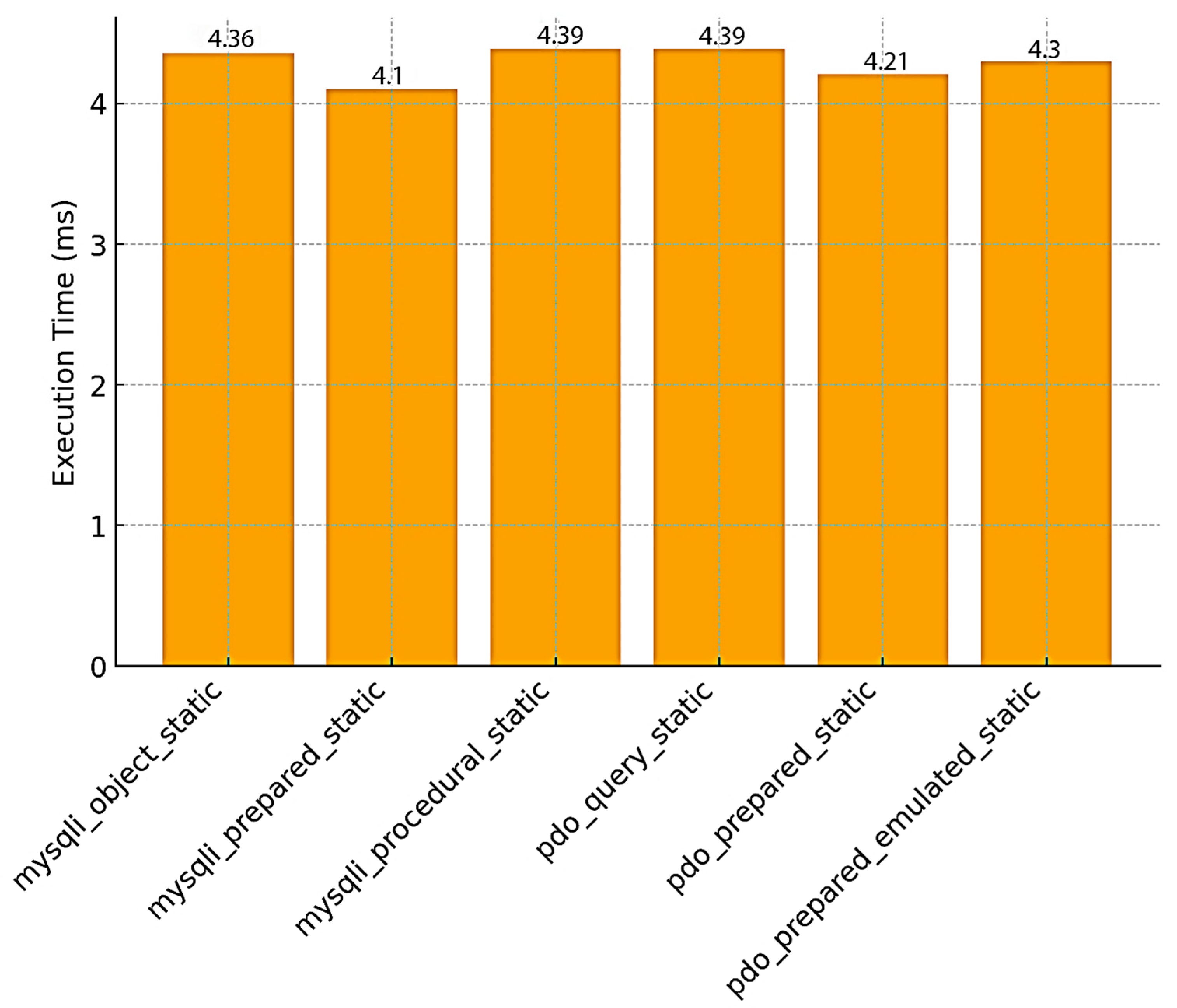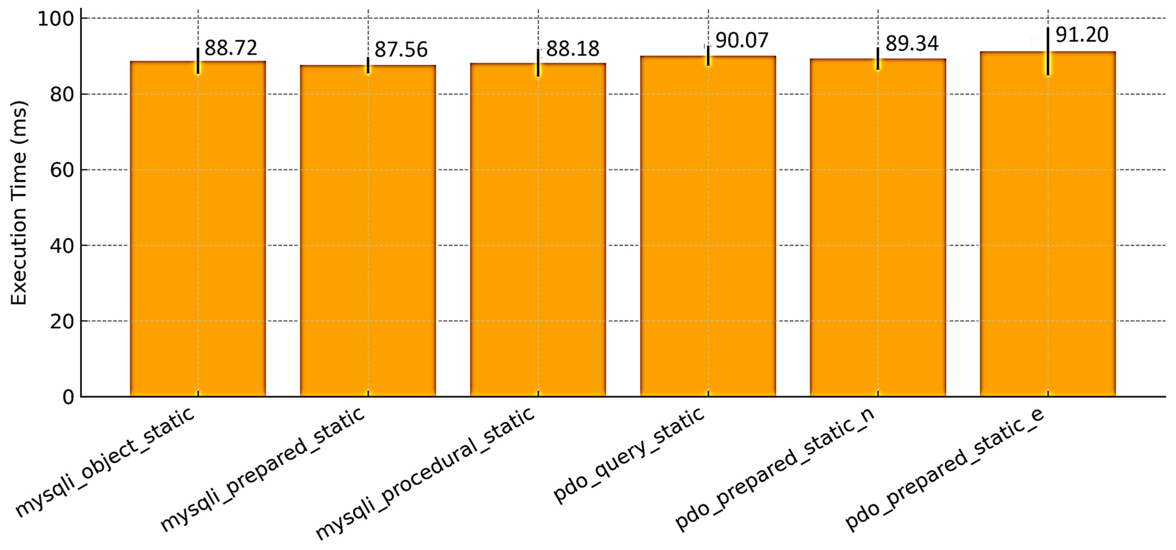 - The MySQLi_prepared_static method had the lowest average execution time and one of the smallest variances, indicating speed and consistency.