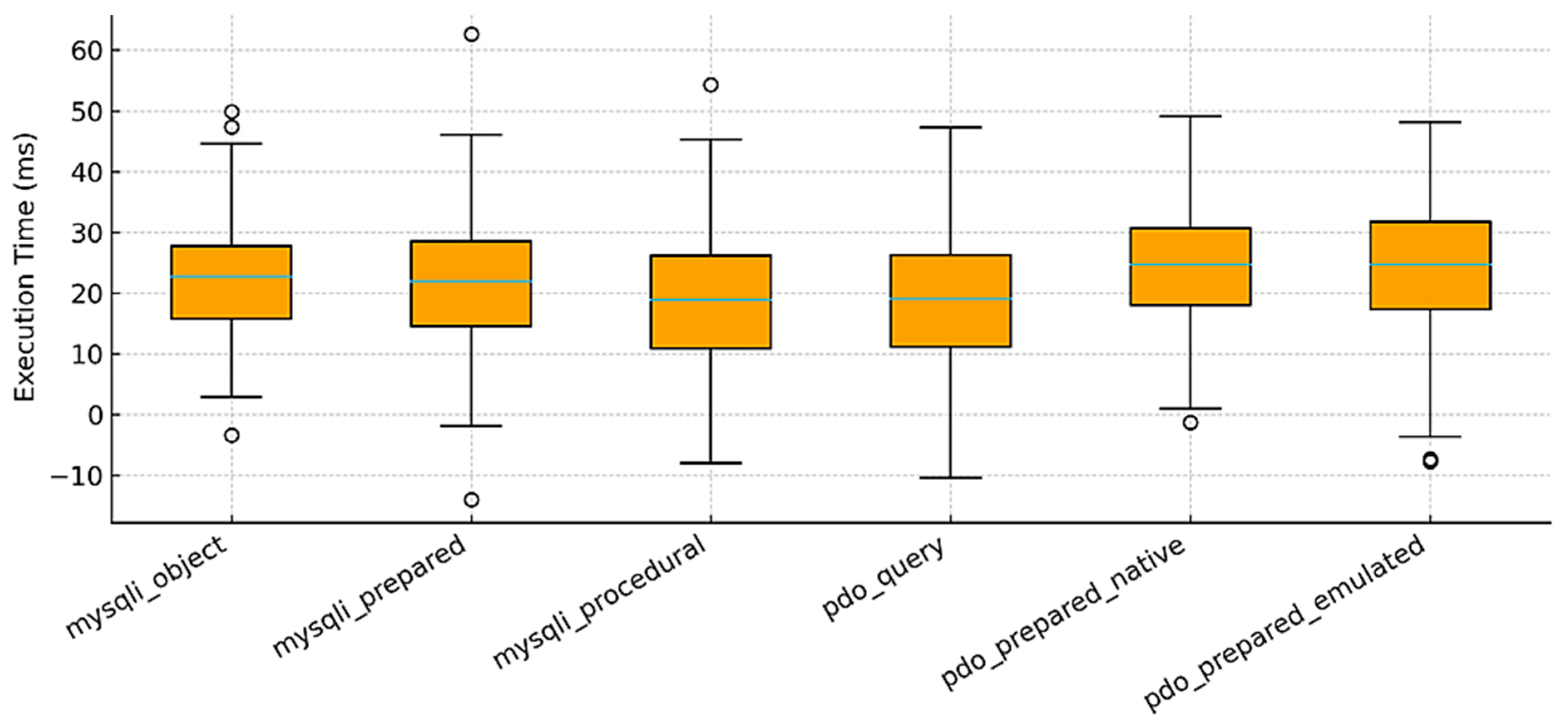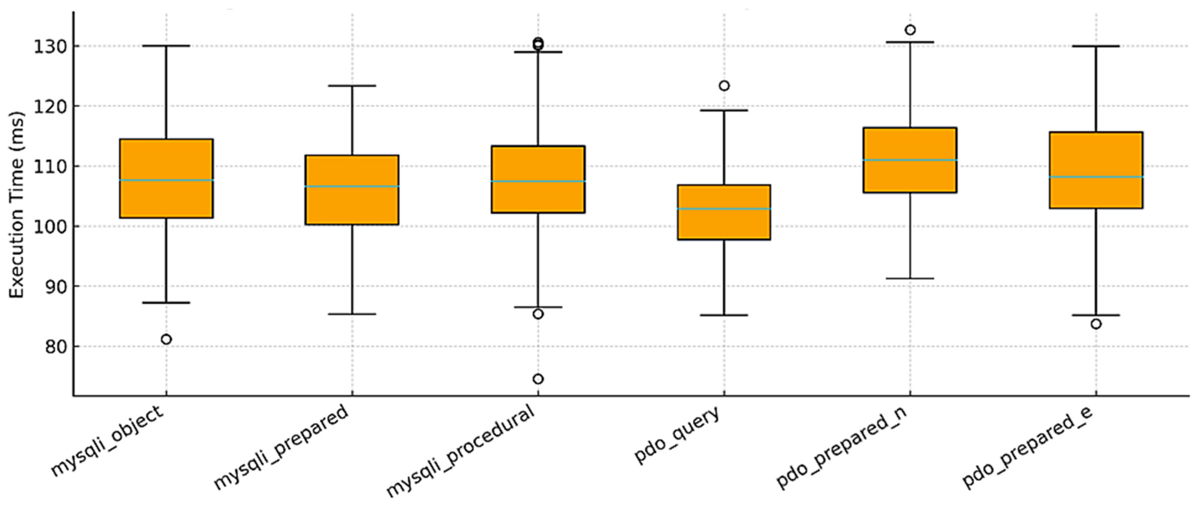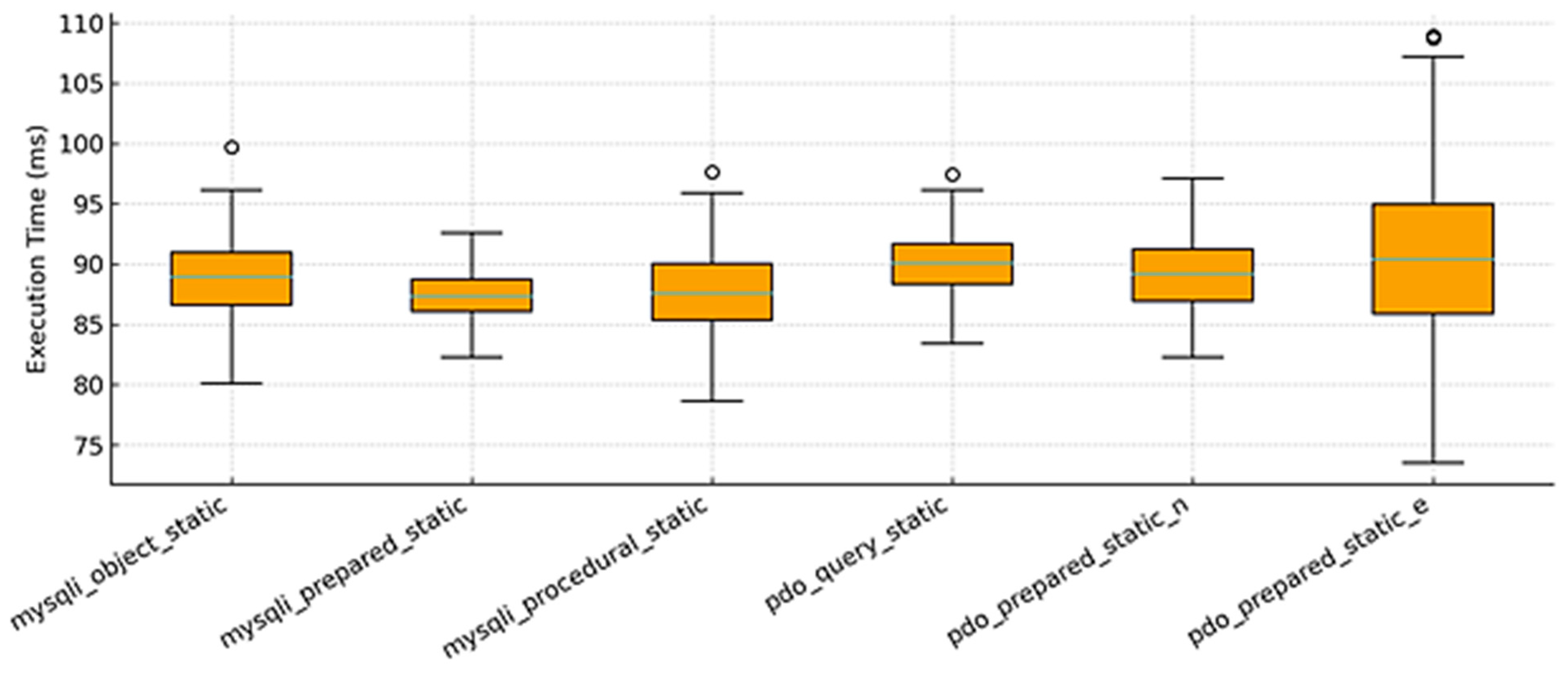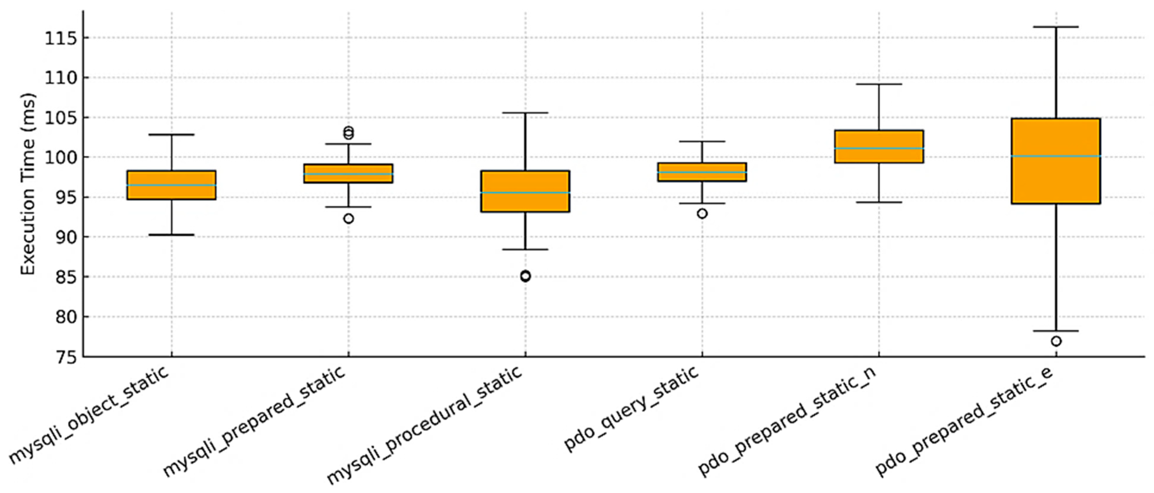 - The MySQLi_prepared_static method had the lowest average execution time and one of the smallest variances, indicating speed and consistency.