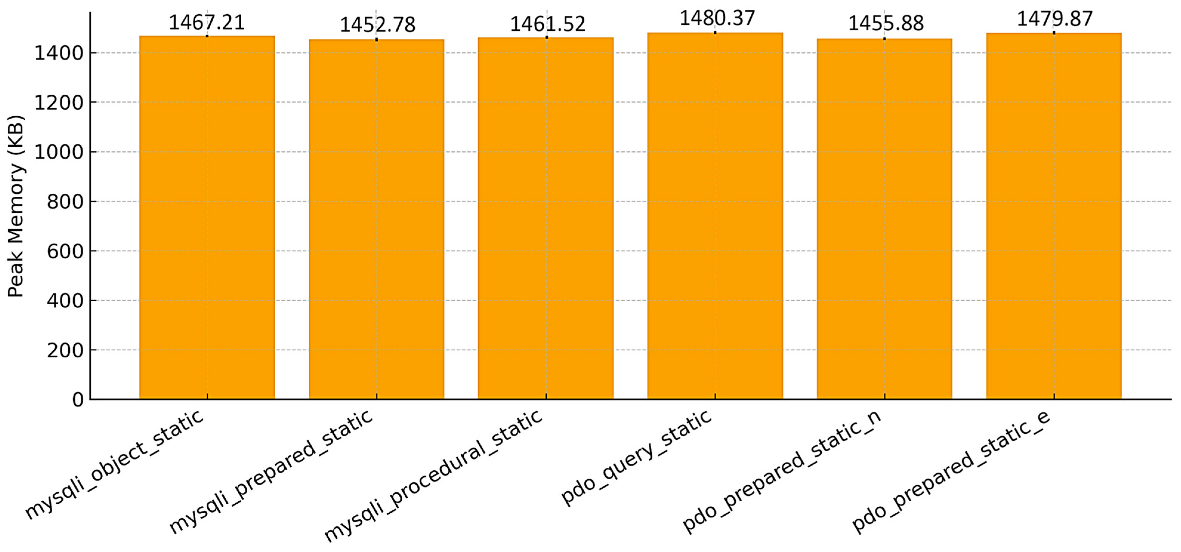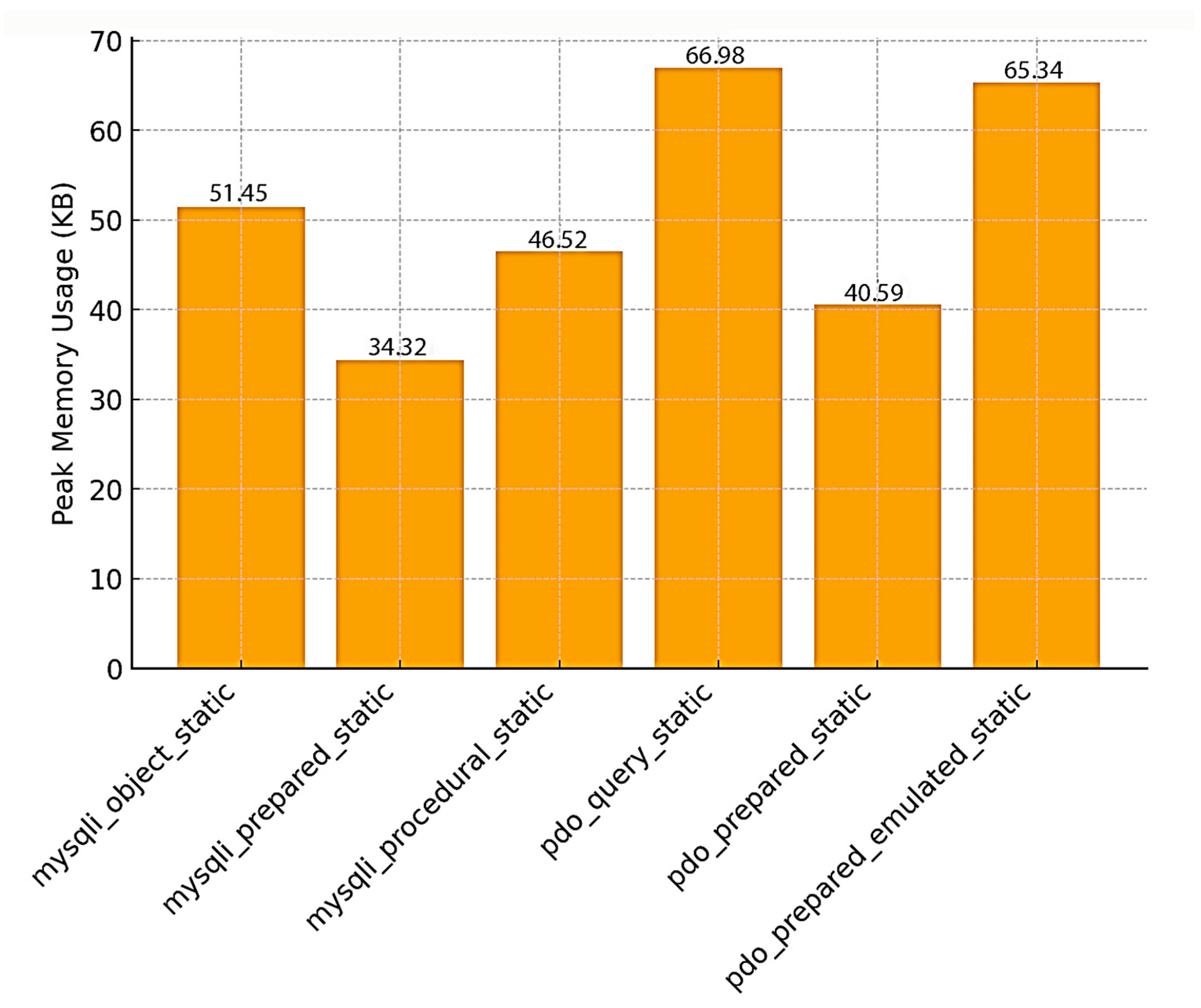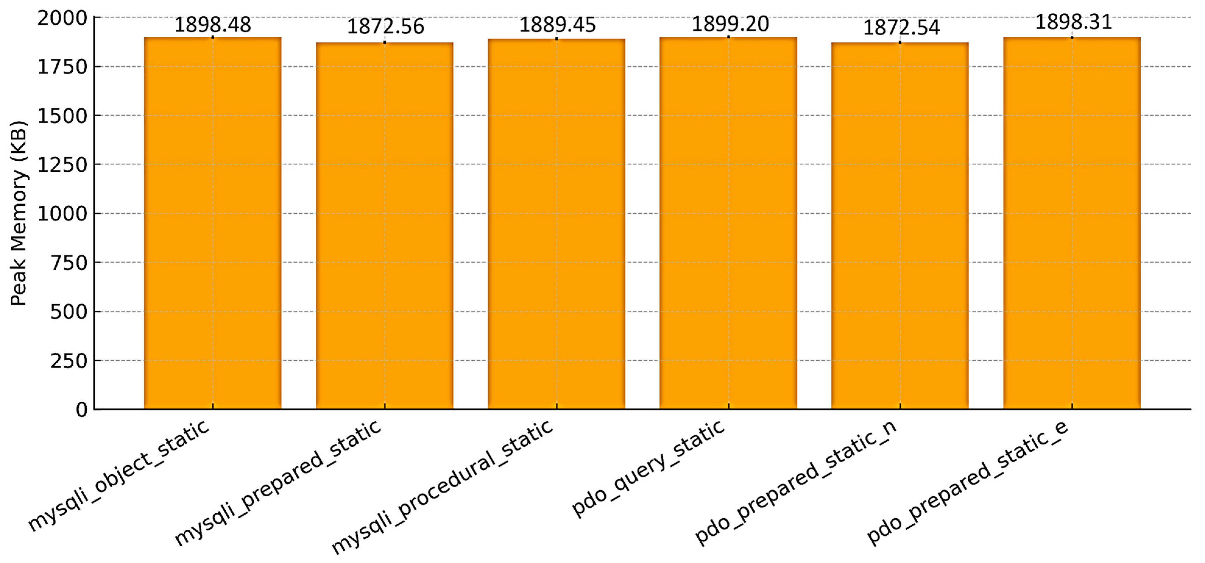 - Emulated prepared statements in PDO (PDO_prepared_emulated_static) used almost the same amount of memory as PDO_query_static, indicating that emulation does not bring advantages in memory efficiency.