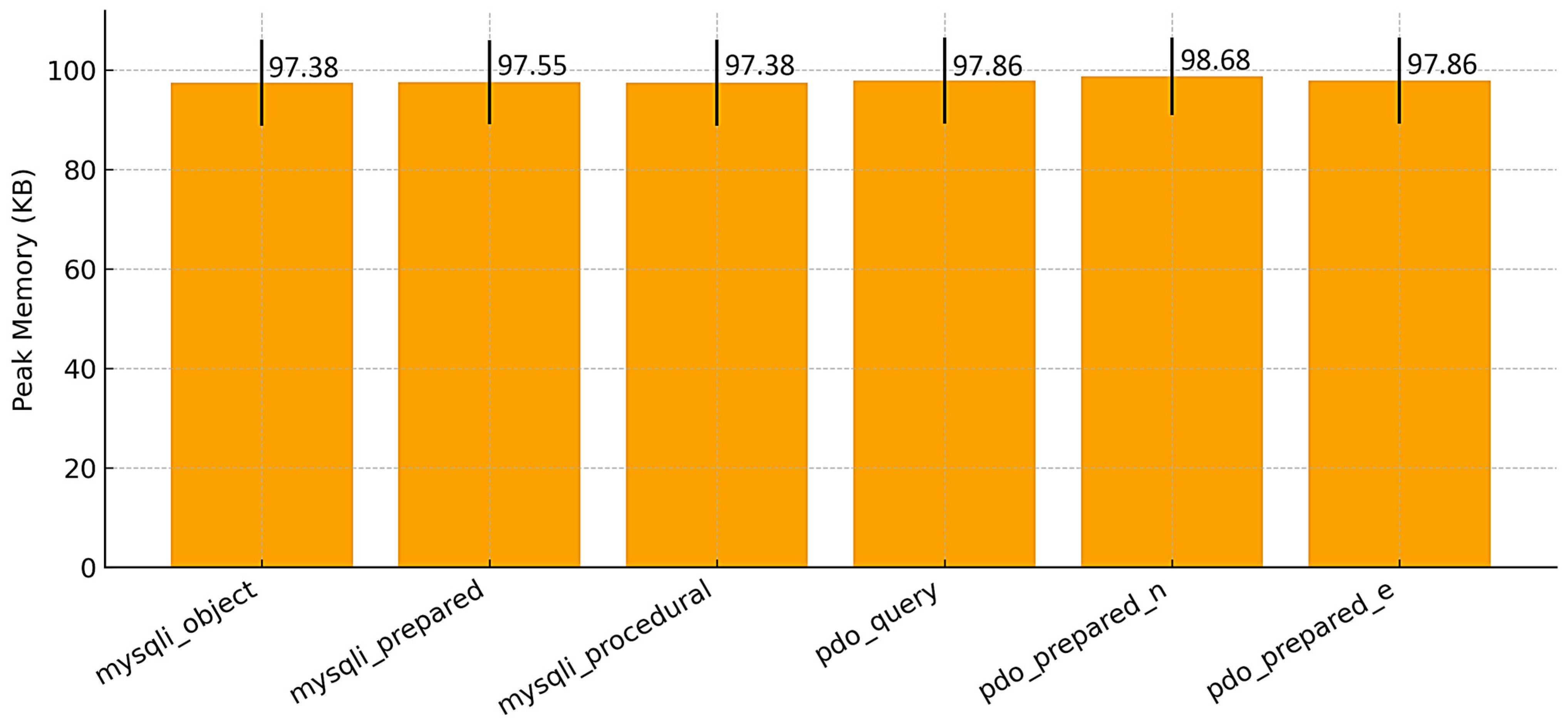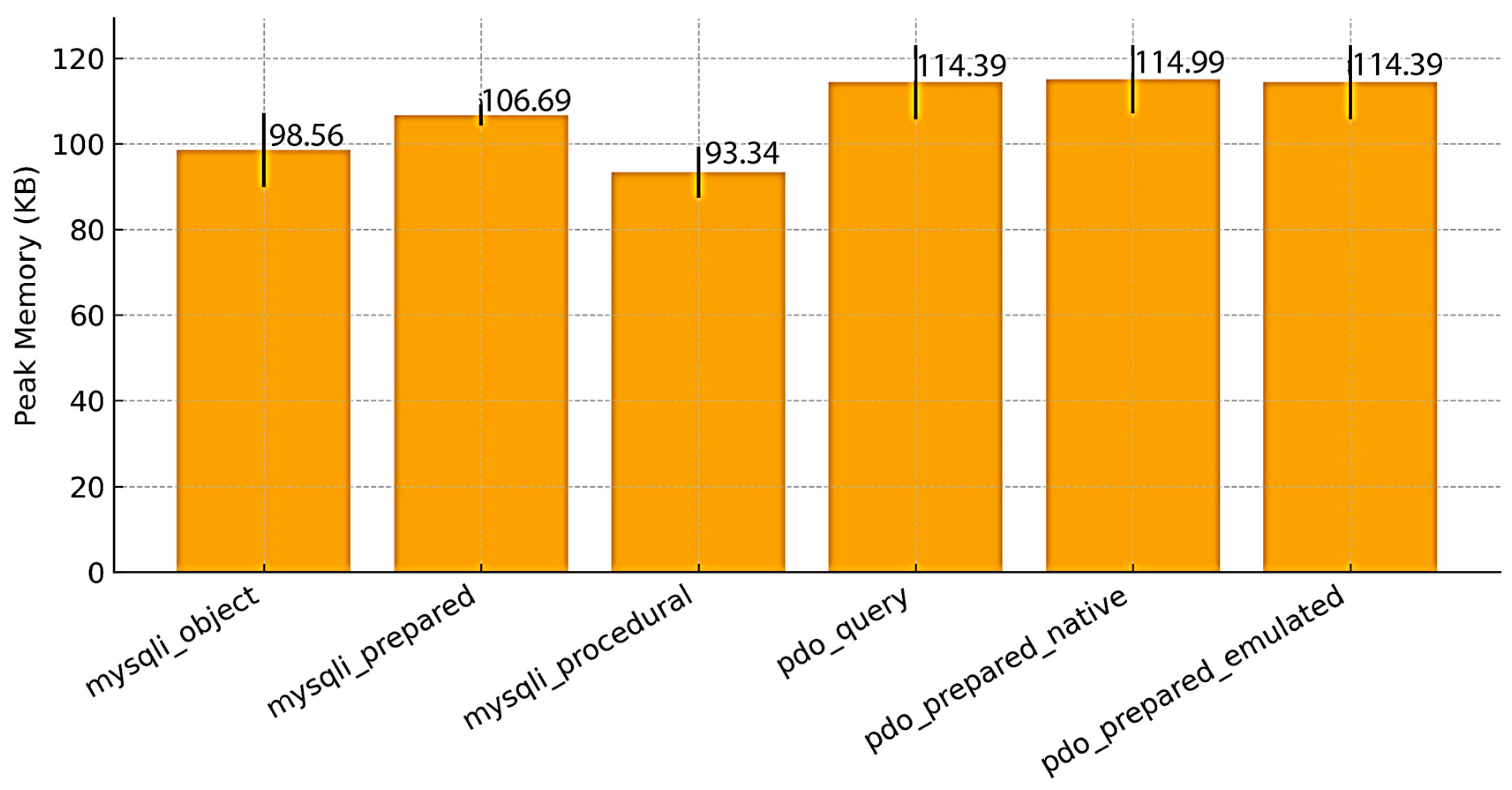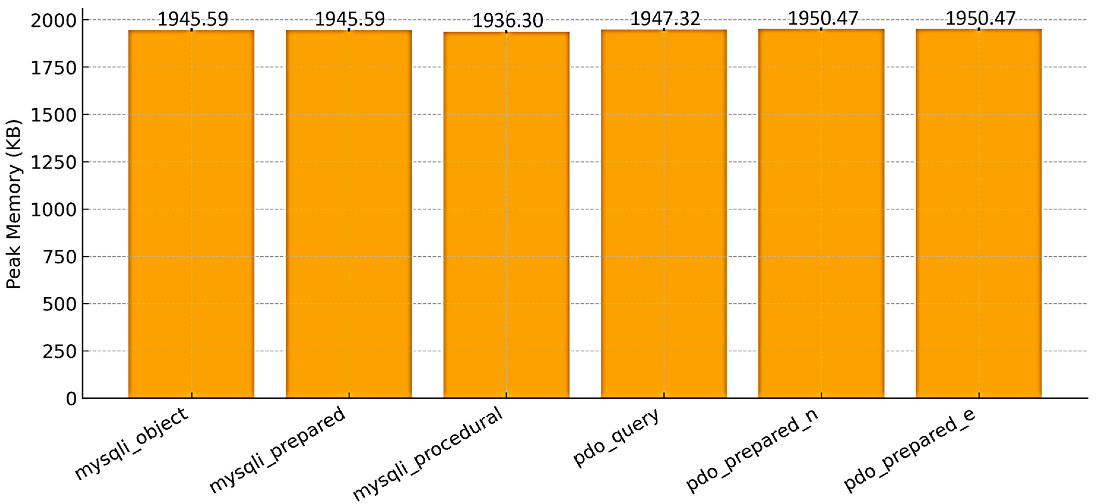- Emulated prepared statements in PDO (PDO_prepared_emulated_static) used almost the same amount of memory as PDO_query_static, indicating that emulation does not bring advantages in memory efficiency.