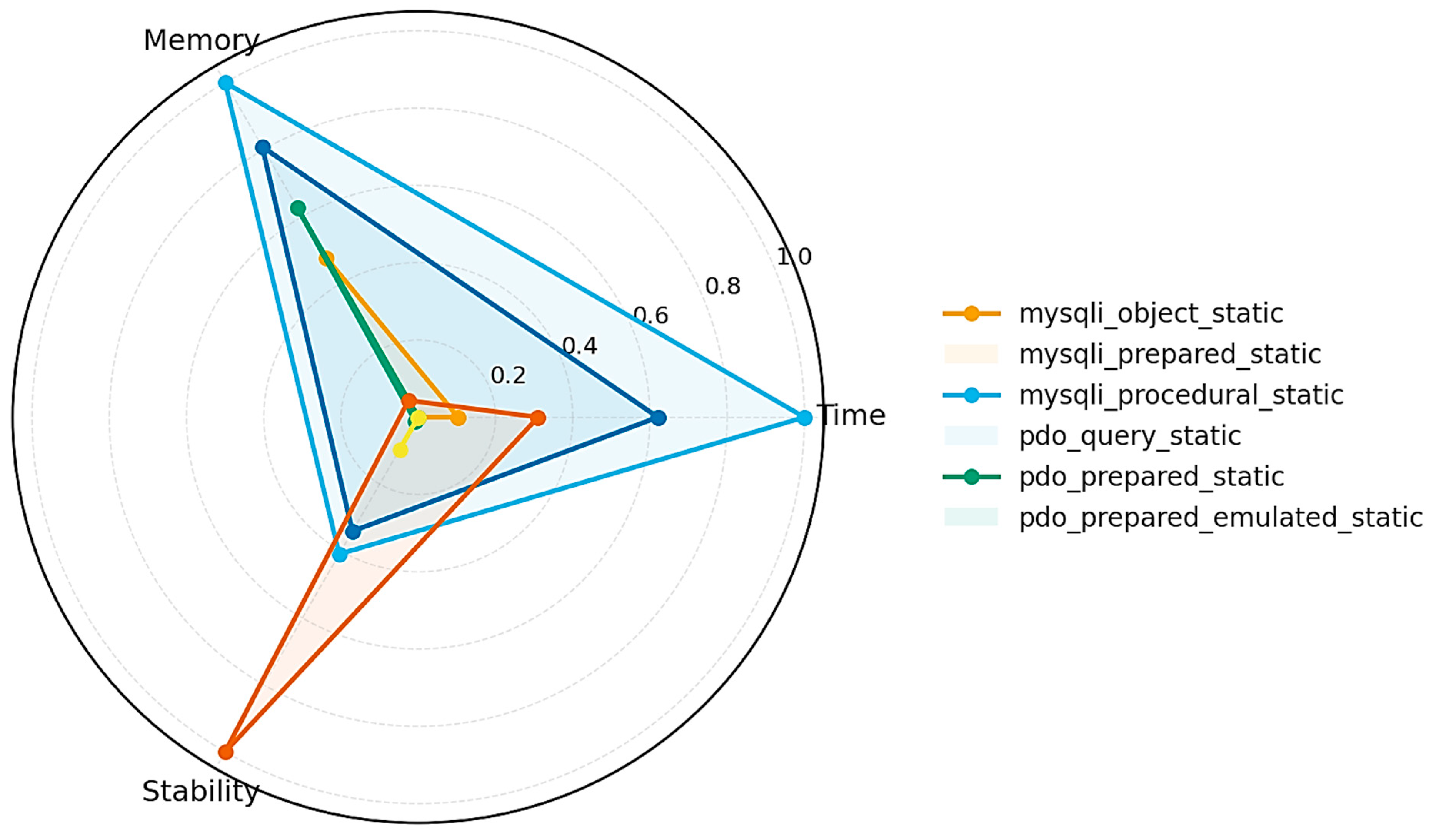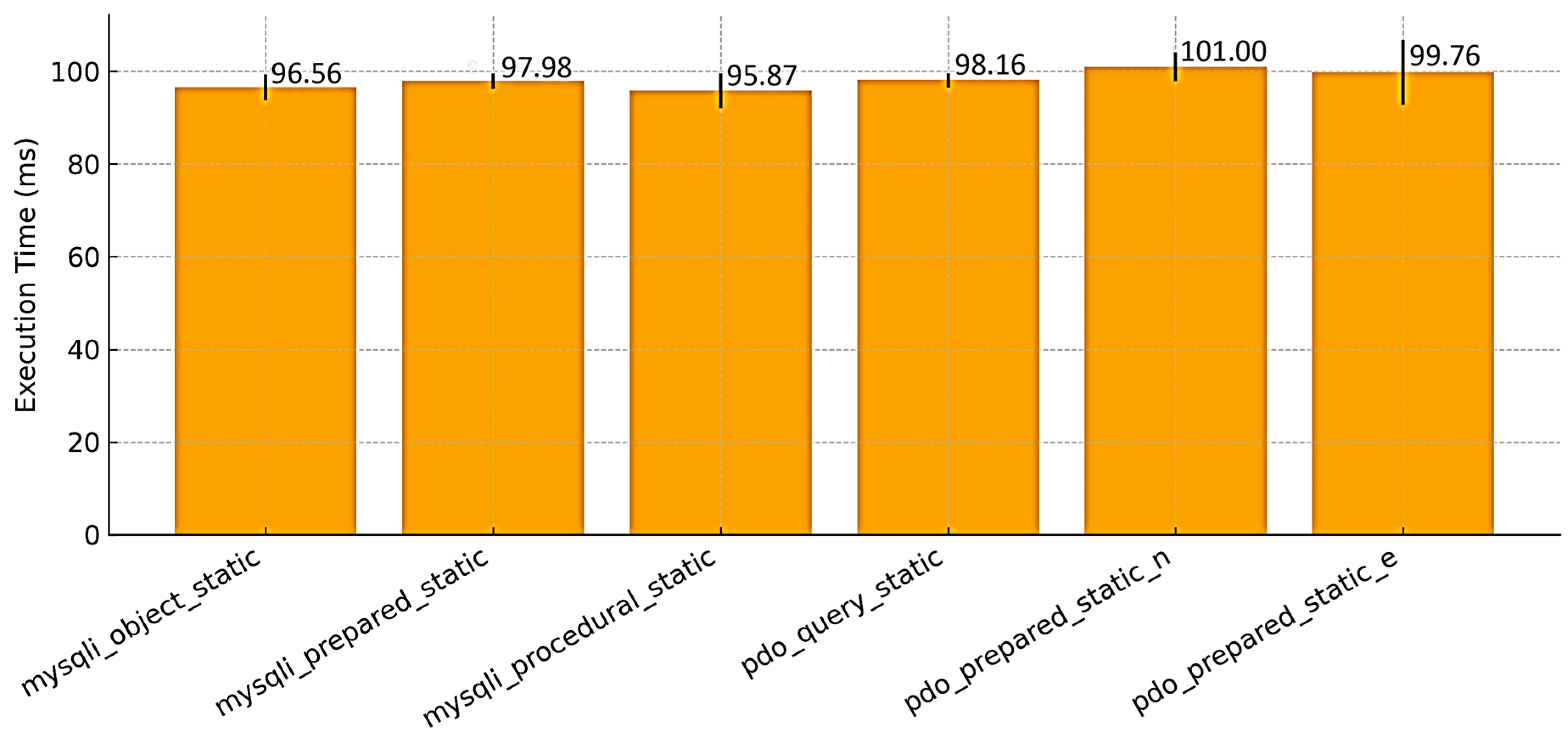 - Although pdo_prepared_emulated_static did not have the best average time, it showed the smallest variation, which can be useful in latency-sensitive applications.