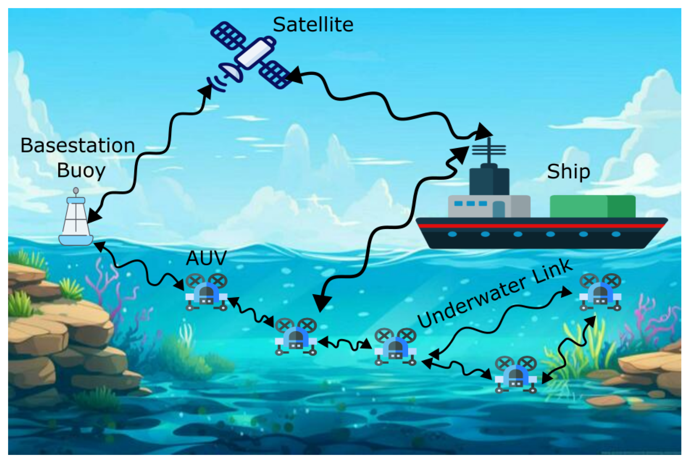 This interdependence is particularly critical in the deployment of multi-AUV networks and swarm robotics. Practical scenarios include cooperative sensing, formation control, and survey missions, all of which require robust and resilient inter-vehicle communication that becomes especially important due to the continuous motion of ROVs and AUVs [