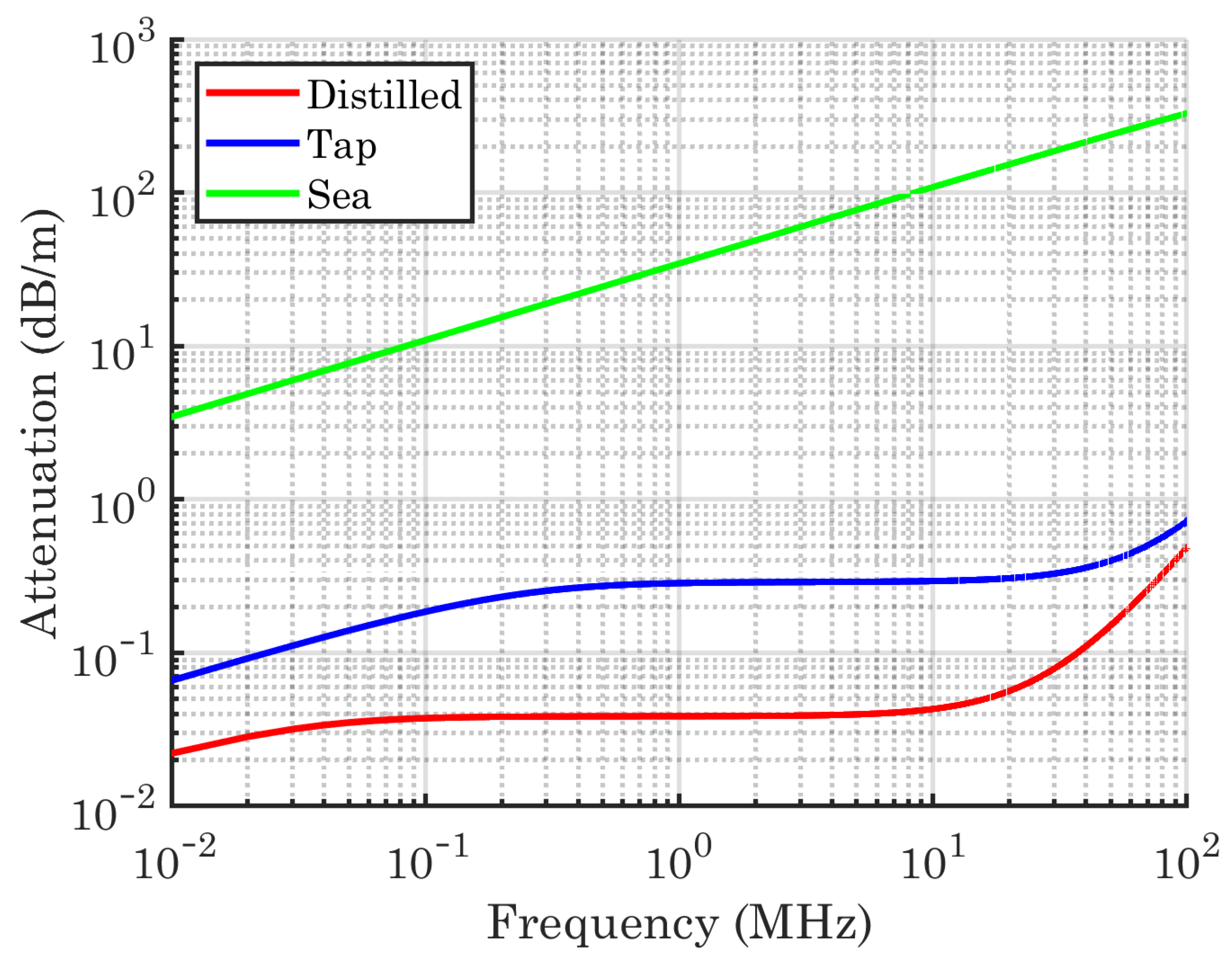2), the attenuation coefficient of an EM signal inside different types of water (distilled, fresh and sea) is displayed in