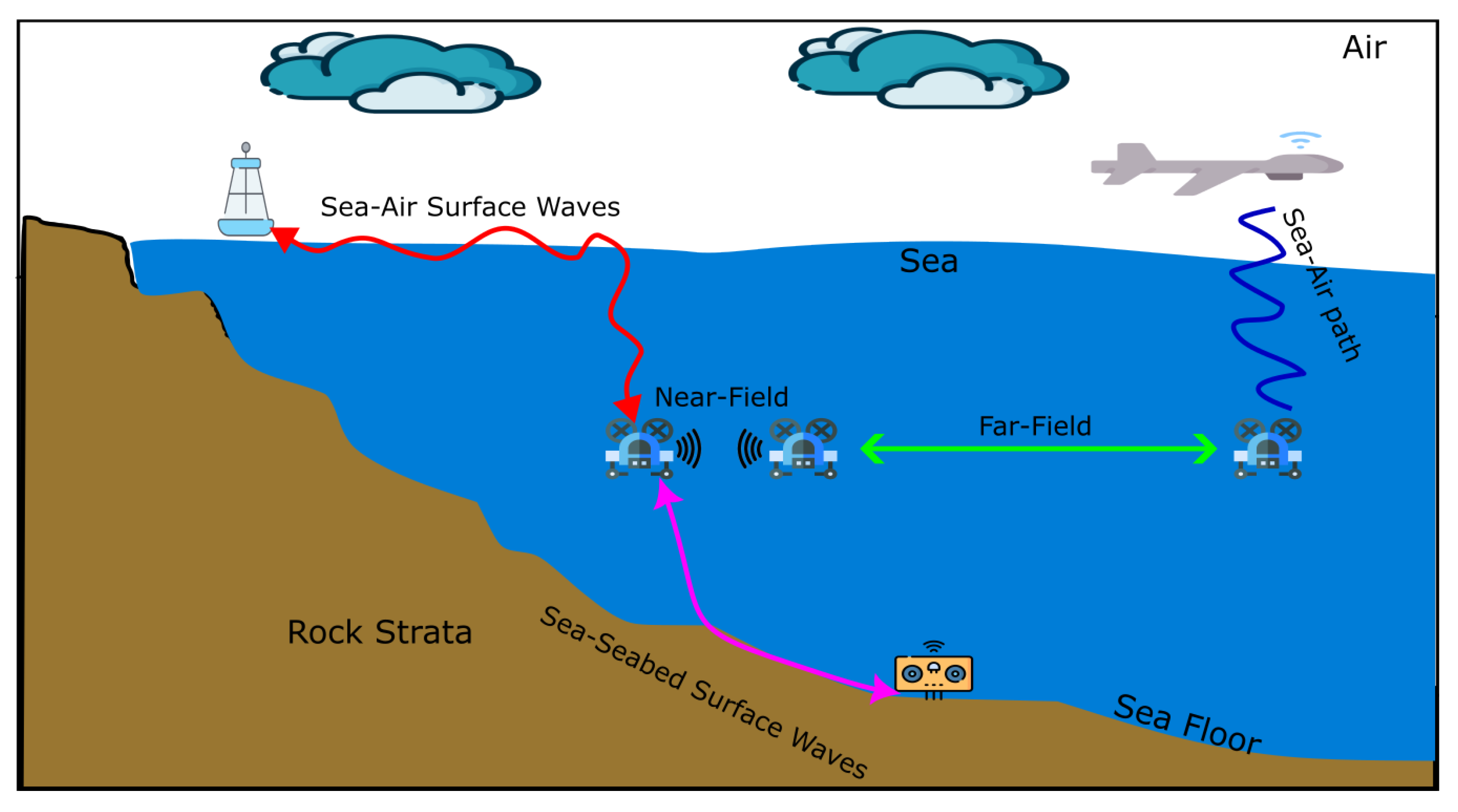 Currently, EM techniques are primarily employed to enable communication between military submarines and land-based control centers, playing a critical role in defense and national security. EM waves propagate effectively through air, water, and across their interface, and their minimal Doppler effect enhances reliability for submarine operations. In air propagation, the dominant attenuation factor is free-space loss, which results from the signal’s energy dispersing as it radiates outward [