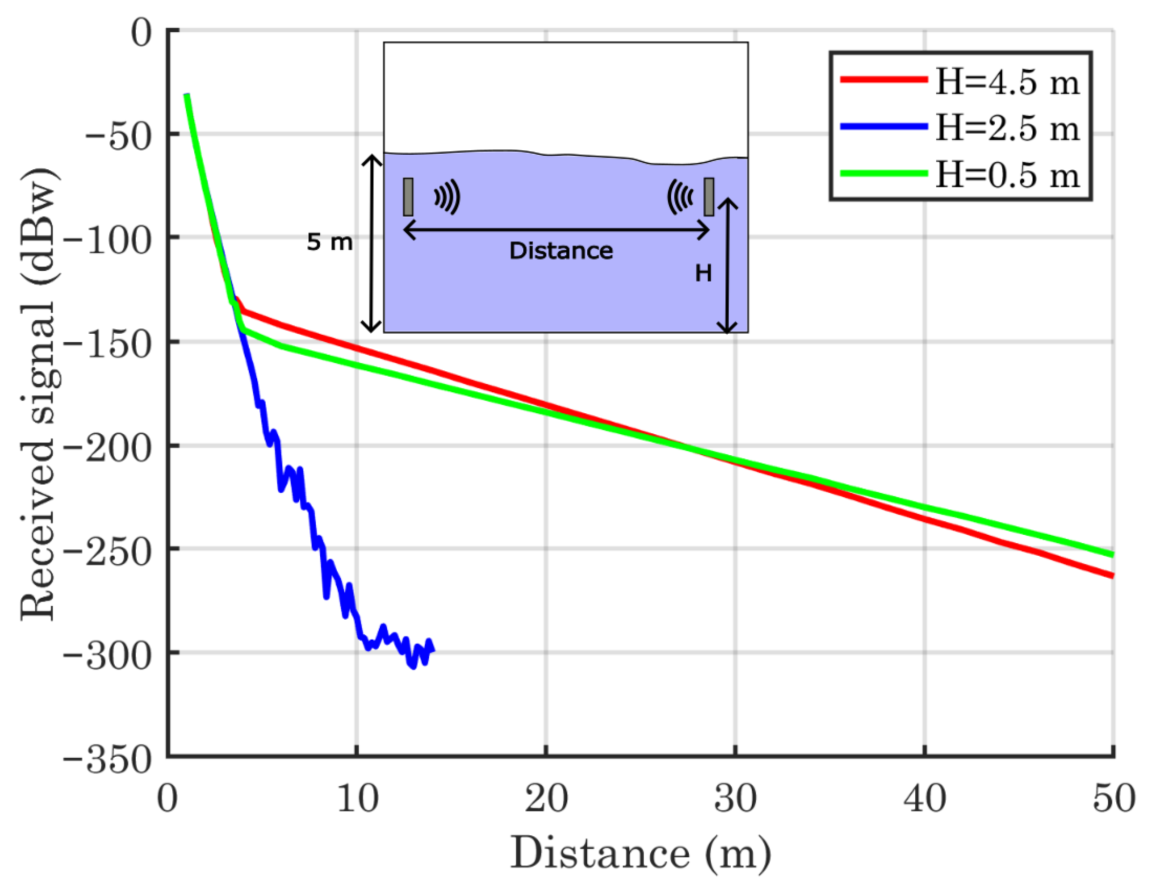 . Beyond this range, when antennas are positioned closer to the water surface or the seabed, the signal attenuates smoother, with an attenuation factor of approximately