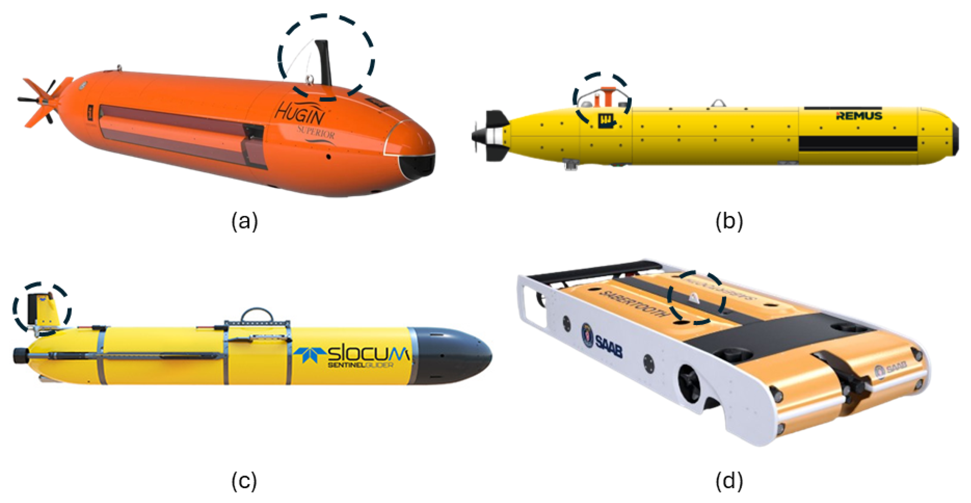 Figure 5 illustrates four representative commercial AUVs/ROVs, where antenna locations are indicated by dashed circles. In these examples, integrated antennas are designed to support both submerged and surface-level communication. To minimize hydrodynamic penalties, antennas are embedded within protective housings or shaped like fins, ensuring that communication capability is achieved without compromising the underwater velocity and efficiency. One of the key challenges lies in designing innovative antenna systems and determining their optimal placement on the vehicle surface to ensure reliable communication without compromising its hydrodynamic performance or underwater maneuverability.