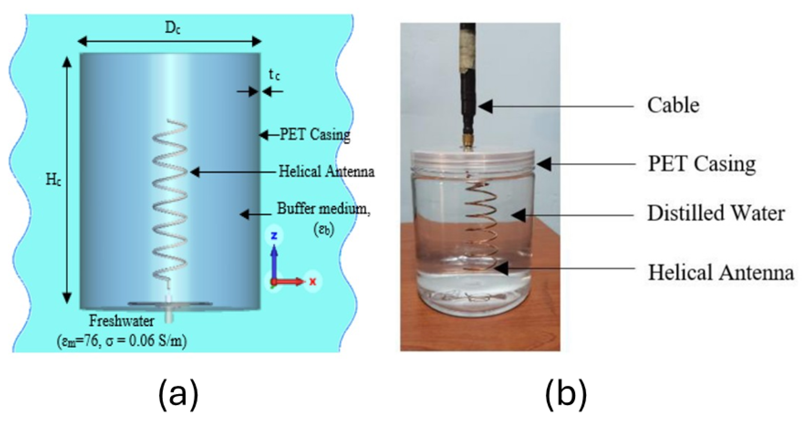 63]—the radiated waves can be generated within a lossless environment before transitioning into the seawater. A particularly effective approach is encapsulating the antenna in distilled water, which matches the dielectric constant of seawater but exhibits negligible conductivity. This isolates the antenna’s reactive near-field from the conductive lossy seawater, thereby minimizing ohmic dissipation while maintaining impedance continuity. Consequently, a robust fabrication strategy requires a compact, liquid-filled sealed enclosure that maximizes matching and prevents direct seawater contact, while facilitating reliable RF and electronic interconnects.
