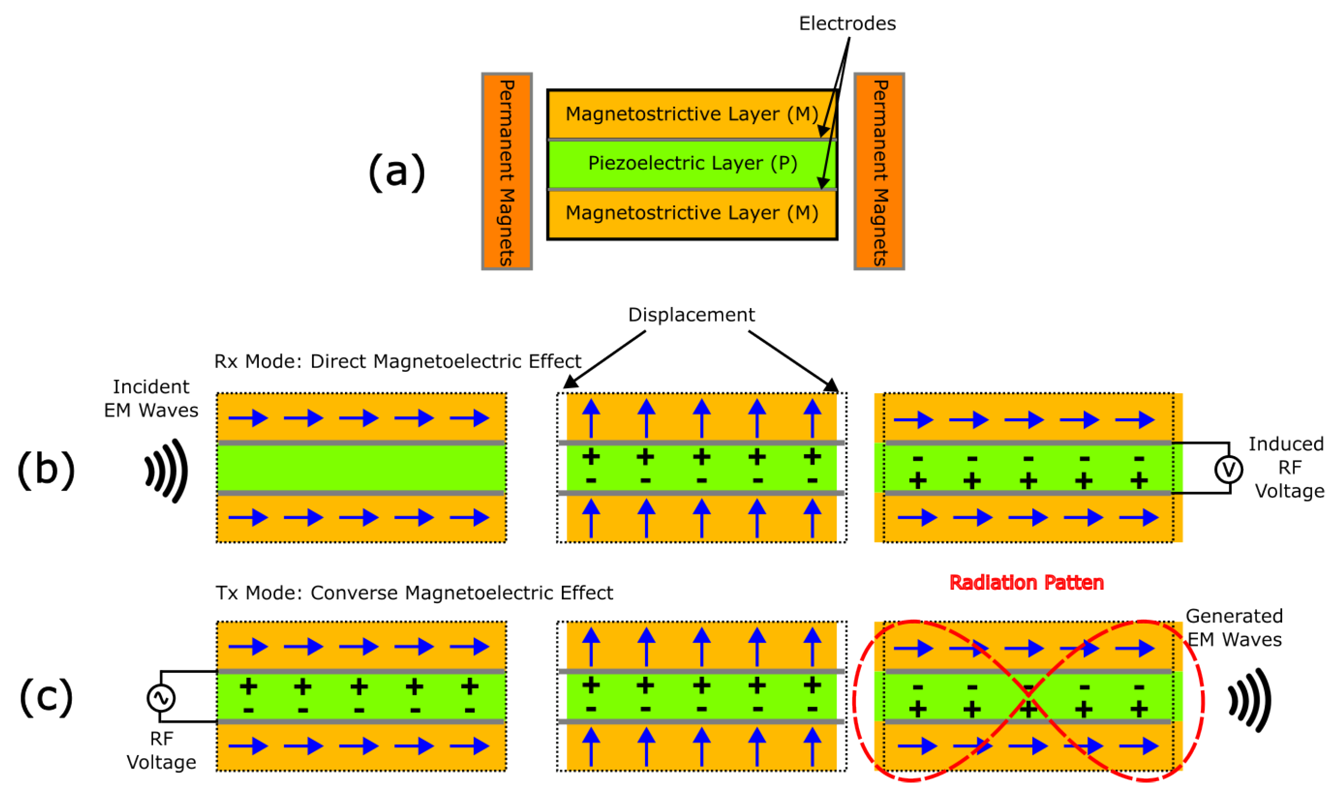 However, the fabrication and operational deployment of ME antennas present significant challenges. The realization of high-performance ME devices is hindered by critical material synthesis and processing constraints. A primary difficulty lies in engineering a rigid, high-quality interface between disparate thin films—typically magnetostrictive metals (e.g., FeGaB or Metglas) and piezoelectric ceramics (e.g., AlN or PZT). Since the device relies fundamentally on efficient strain transfer, any interface defects, lattice mismatches, or poor adhesion will severely degrade the electromechanical coupling coefficient [