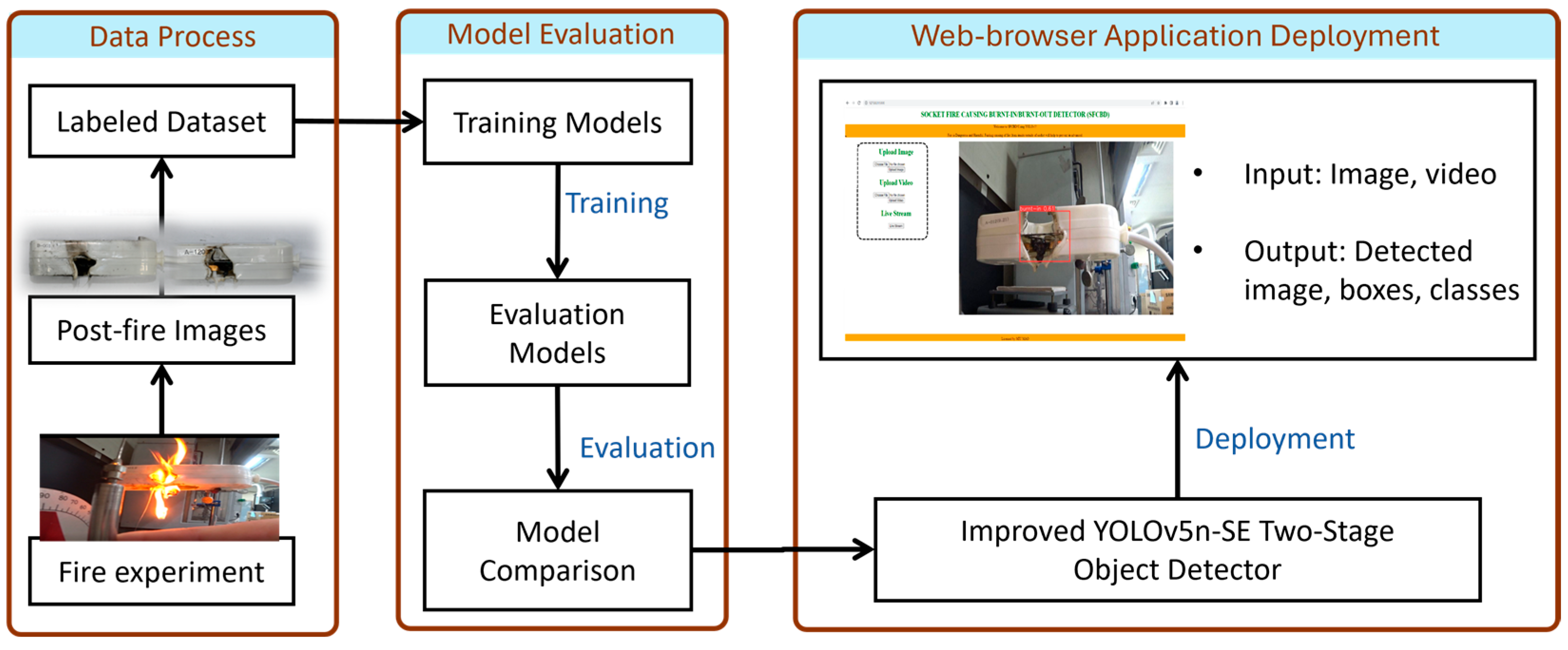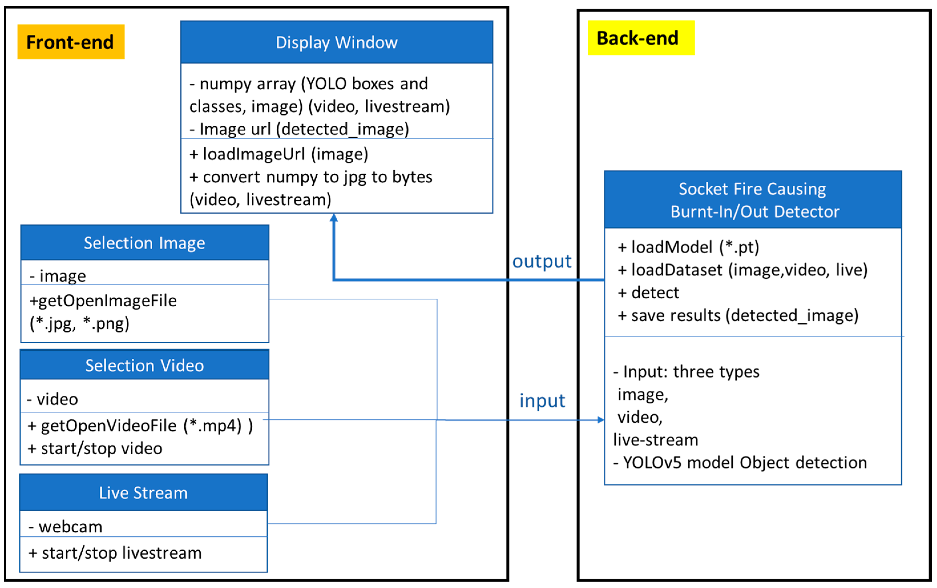 - We propose an improved version of the conventional YOLOv5n by adding squeeze-and-excitation networks (SENet) into the existing YOLOv5 backbone, following a two-stage detector architecture instead of a one-stage detector, including a first stage of socket detection and a second stage of fire-causing classification into either the burnt-in or burnt-out categories.