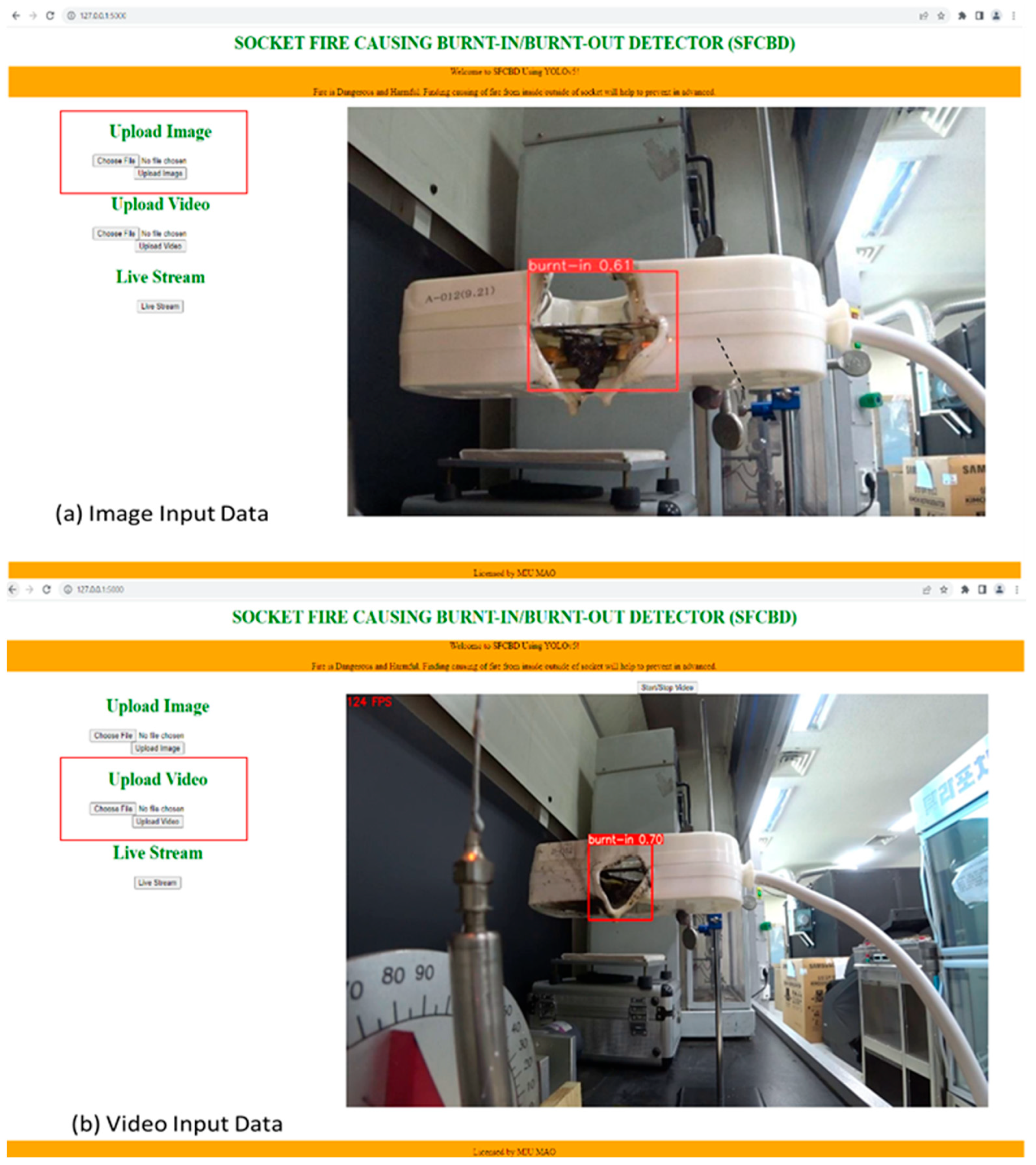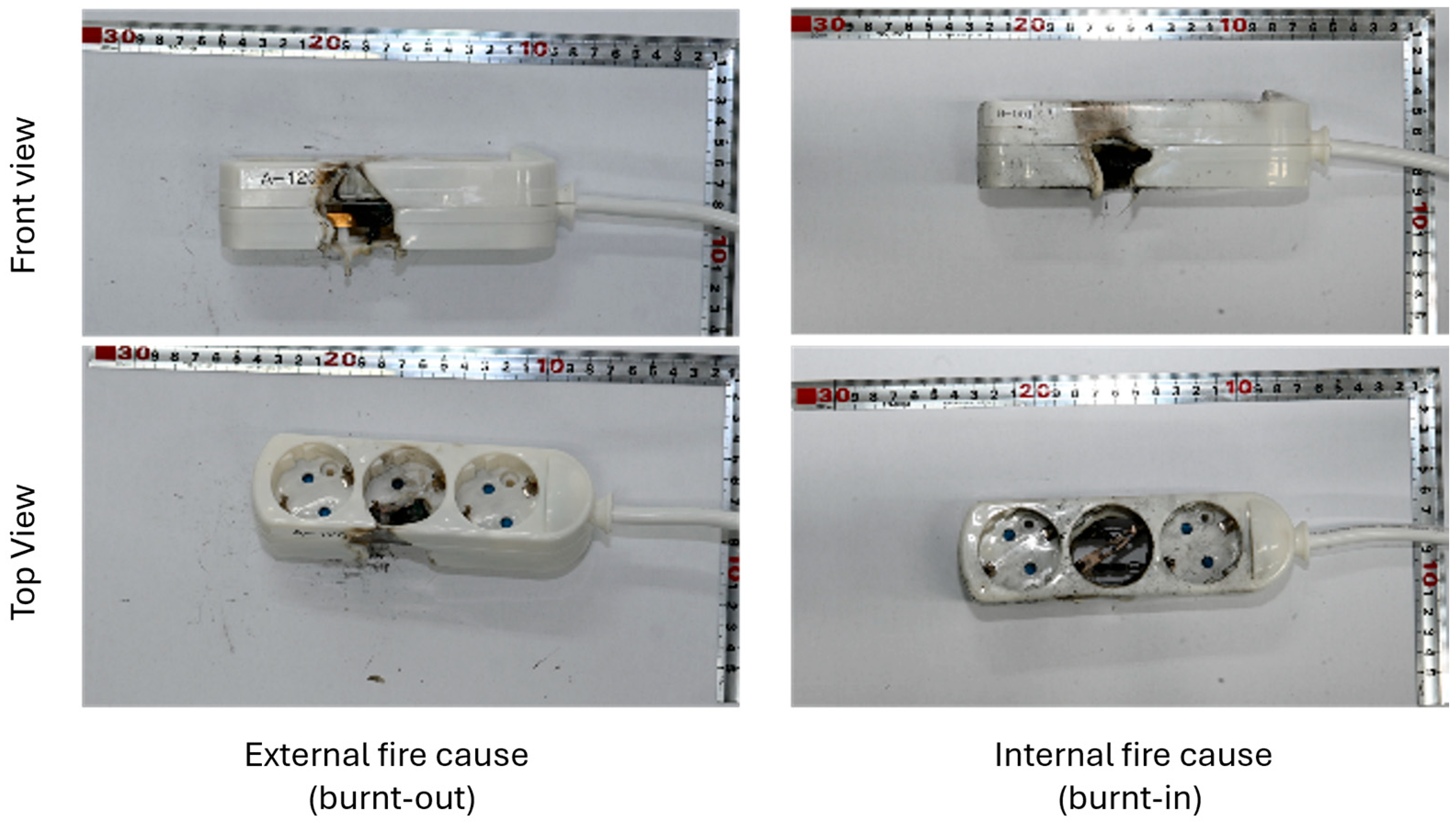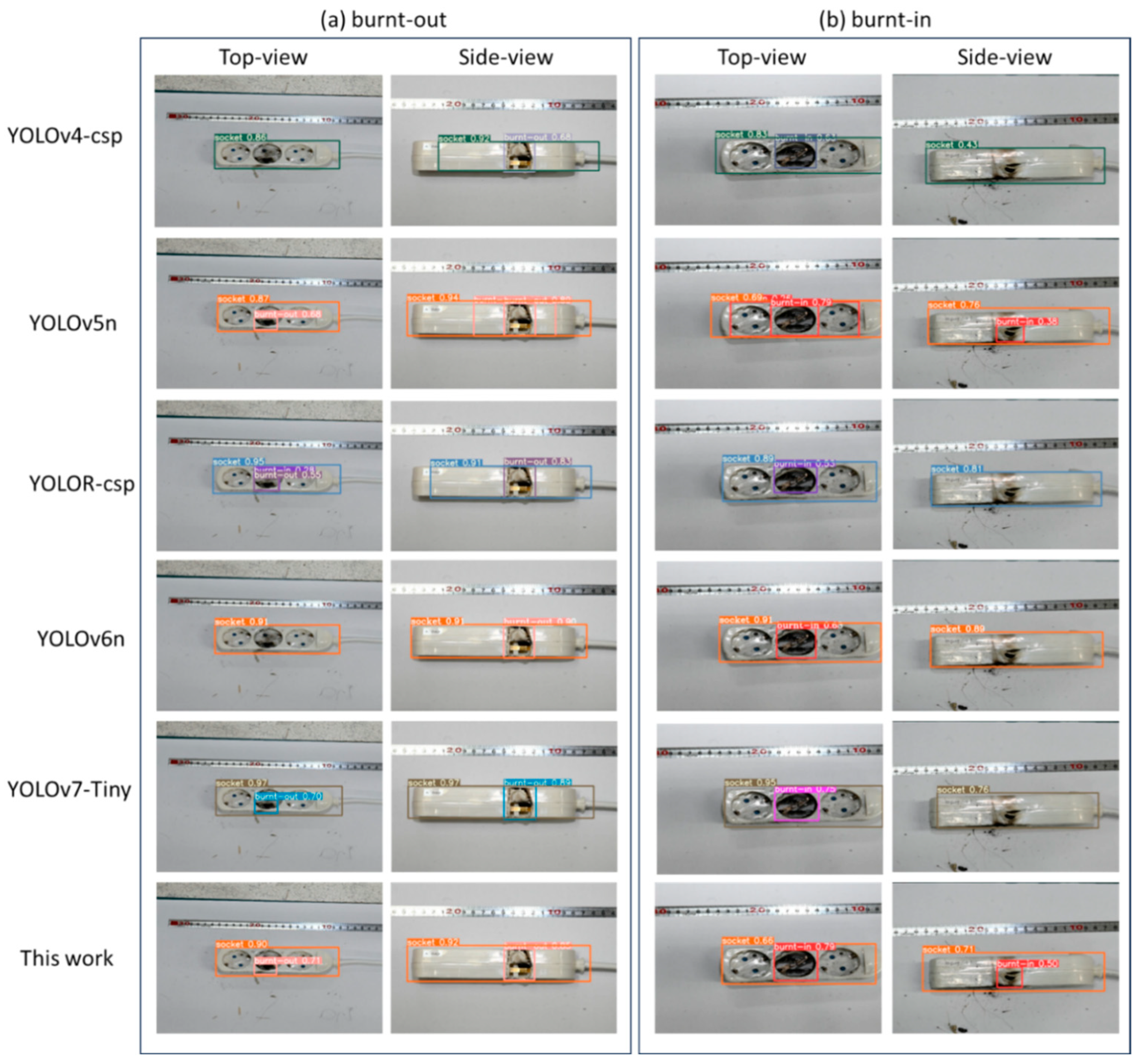- We verify the feasibility of YOLO-based deep learning models, i.e., YOLOv4-csp, YOLOv5n, YOLOR-csp, YOLOv6n, and YOLOv7-Tiny for the classification task of identifying fire-causing reasons (internal as “burnt-in” versus external as “burnt-out” sources) in multi-socket outlets.
