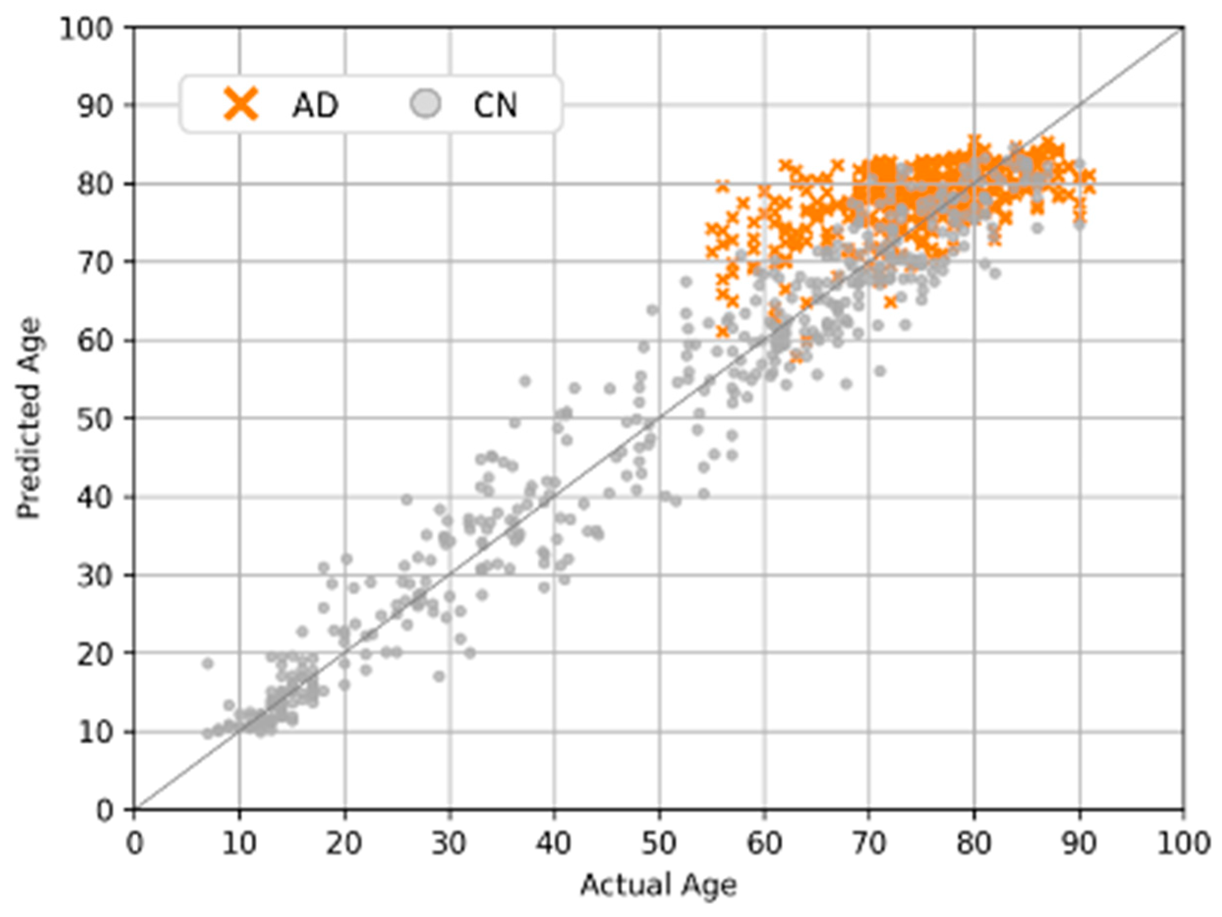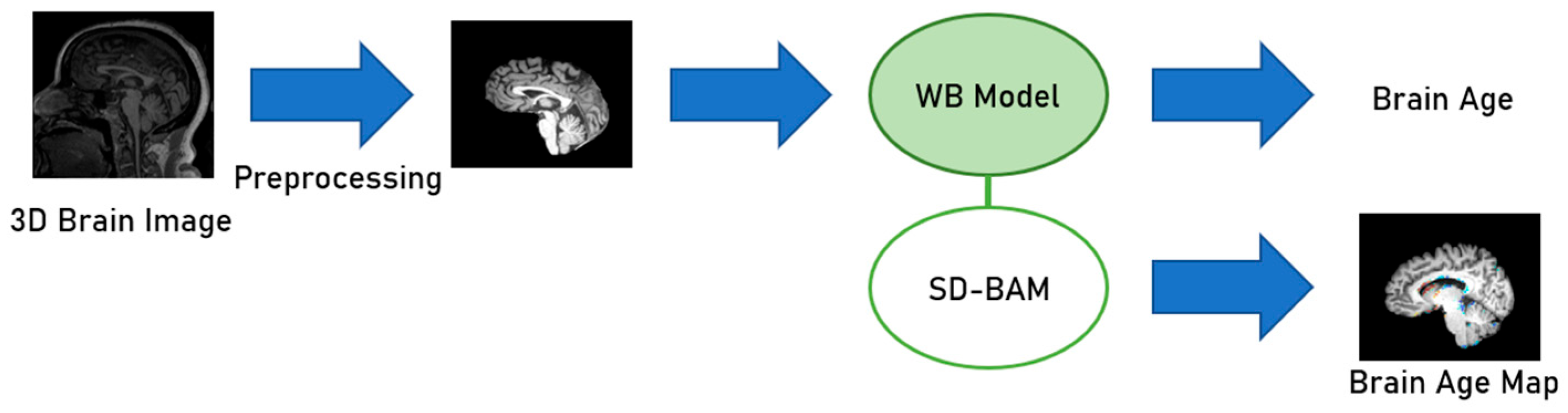 - Peng, H.; Gong, W.; Beckmann, C.F.; Vedaldi, A.; Smith, S.M. Accurate brain age prediction with lightweight deep neural networks. Med. Image Anal. 2021, 68, 101871. [Google Scholar] [CrossRef]