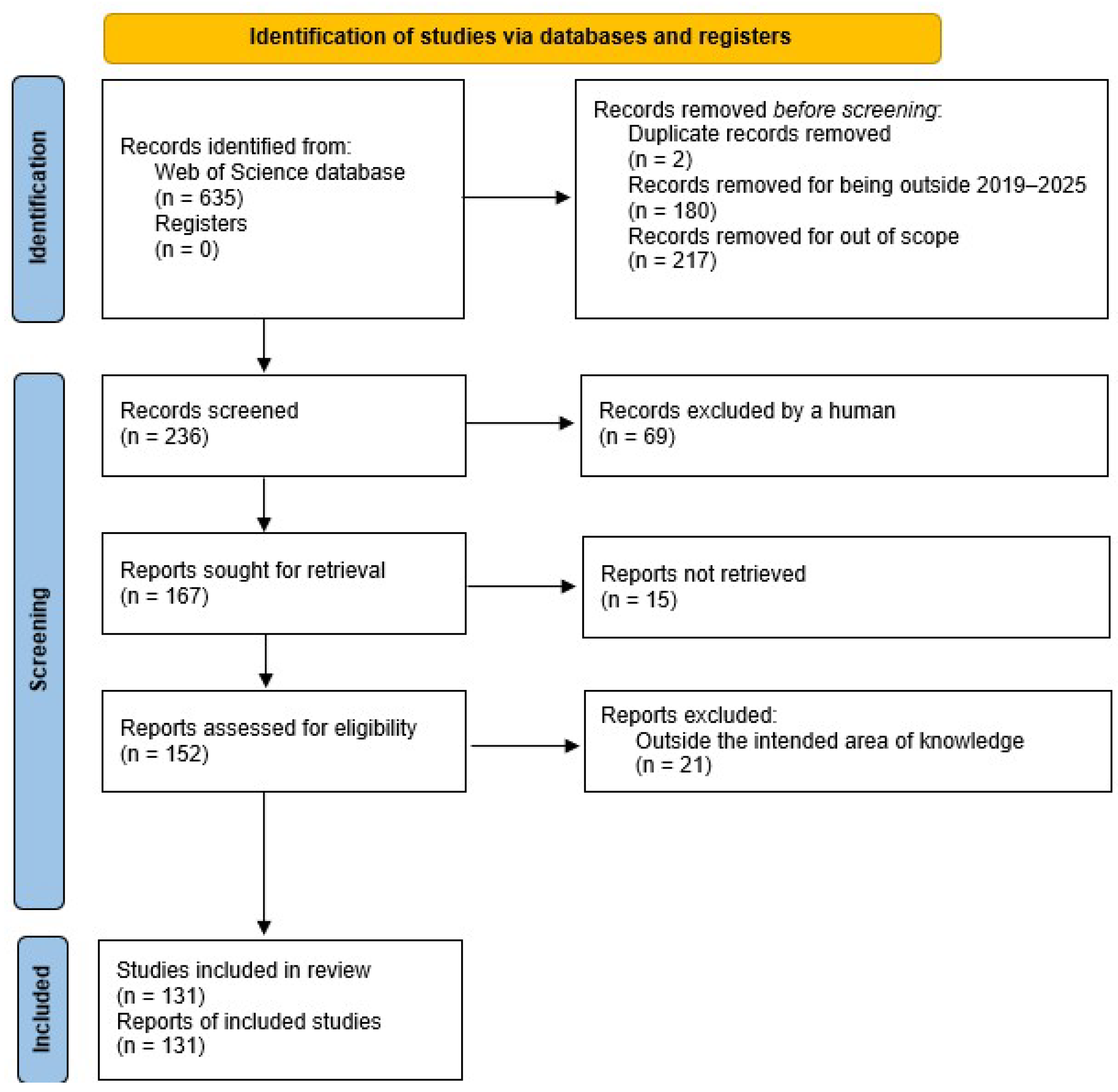 Figure 1. The initial search generated 635 publications. To ensure the review was up-to-date and relevant, only manuscripts published between 2019 and 2025 were considered, leading to the exclusion of older publications. This refinement led to 453 manuscripts. Additionally, duplicate entries were removed, and publications that were either outside the intended area of knowledge or unavailable in full text were discarded. This filtering process resulted in a refined pool of 236 manuscripts.