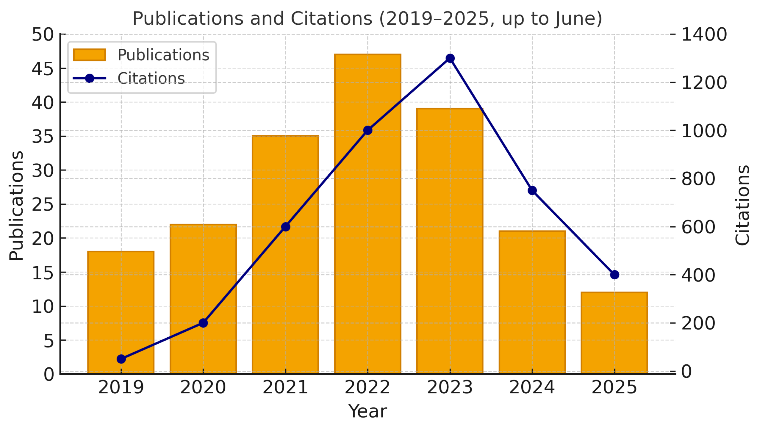 Figure 2, citations grew rapidly during the analyzed period (2019 to 2025). Regarding the number of publications per year, there has been a decline in 2023. Of the publications analyzed, manuscripts [
