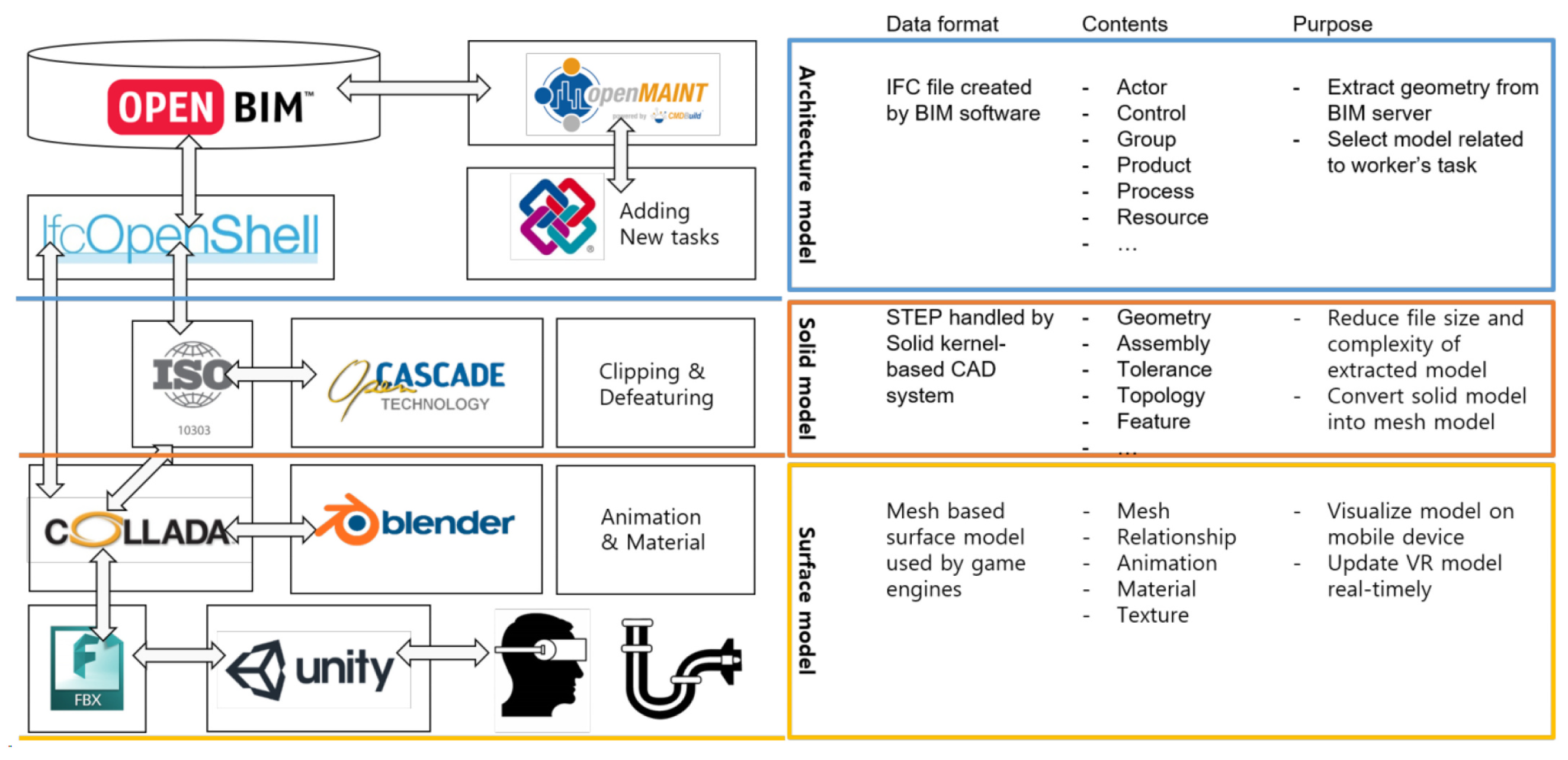 56]. Data interoperability issues typically involve the need for multiple conversions, requiring moving from native BIM data formats to intermediate formats, and then to formats understood by AR tools. This conversion may cause the loss of semantic information, introduce errors and artifacts due to geometry simplification, and the multiple conversions involve brittle pipelines that are hard to maintain. Open standards (e.g., openBIM) exist but do not provide a direct path from BIM data format to AR data format. System integration is directly affected by the lack of full data interoperability, long toolchains, and brittle workflows. Systems may include diverse tools and data such as BIM, GIS survey data, AR engines, IoT for live data, and data exchange data formats (ICF, BCF, JSON, etc.). Many BIM and AR integration prototypes assume a relatively static model, hindering real-time updates on models and information, Furthermore, latency and bandwidth limitations cause synchronization and consistency issues.