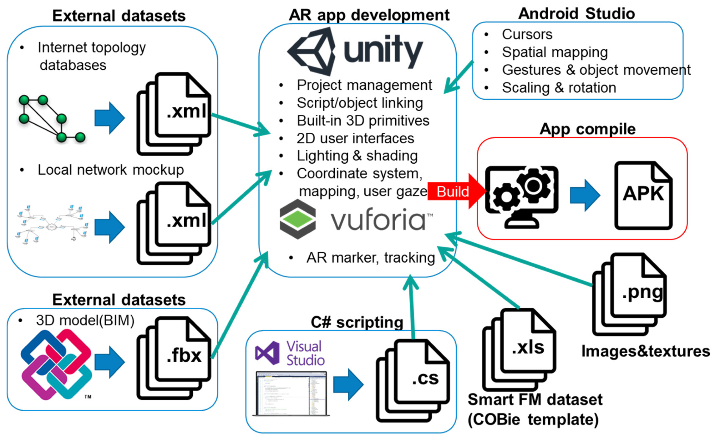 24], the proposed AR-based smart FMS was implemented following the defined BPMN workflow and UI specifications, with AR data generation and data-transmission simulation aligned to the maintenance scenario. The prototype application was developed in C# using Unity and PTC Vuforia, and deployed on Android mobile devices. BIM data were based on an IFC2 × 4 model created in Autodesk Revit, from which COBie information was automatically extracted. Marker-based AR visualization was adopted, using QR codes to identify spatial locations and retrieve corresponding COBie maintenance attributes. The overall development process and tools are illustrated in
