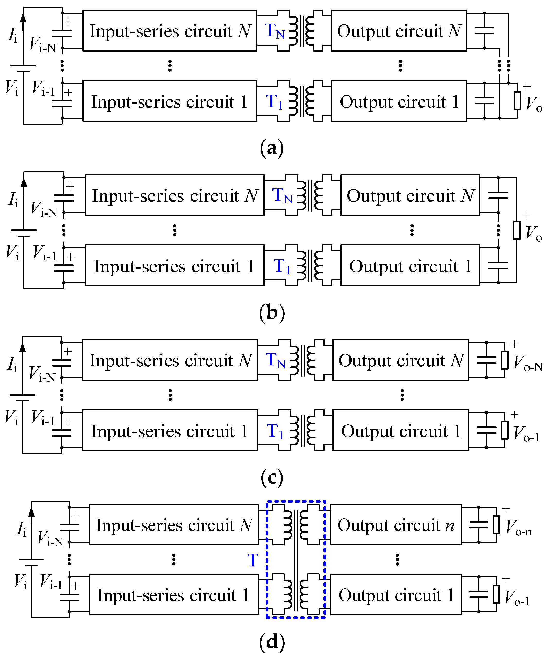 Figure 1b. In addition to the input voltage sharing, output voltage and current sharing should also be ensured in these two kinds input-series converters [