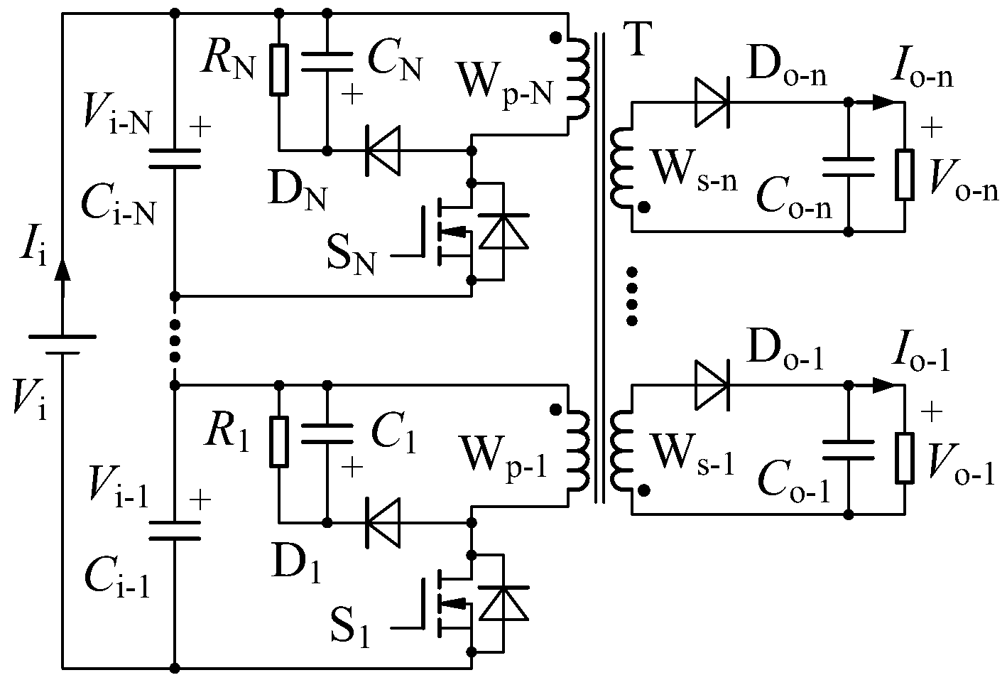 In the input-series circuits, there are identical components and parameters, including the input filter capacitors (Ci-1 = … = Ci-N), the switches (S1, …, SN), the turn numbers (Np-1 = … = Np-N), and the self-inductances (Lp-1 = … = Lp-N) of the primary windings (Wp-1, …, Wp-N) in the integrated transformer (T) and the absorbing circuits (R1 = … = RN, C1 = … = CN, and D1, …, DN).