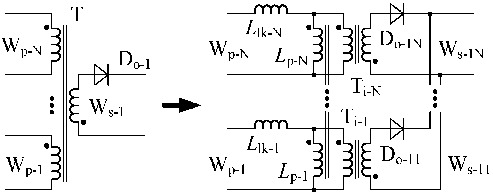 (2) In this model, the equivalent single secondary winding (Ws-1) is divided into N identical parts (Ws-11, …, Ws-1N), and they are used as the secondary windings of the ideal transformers (Ti-1, …, Ti-N). Ti-1, …, Ti-N are connected in parallel in the secondary sides, where their turn ratios are identical (Np-1/Ns-1). Do-11, …, Do-1N are used as the output rectifier diodes.