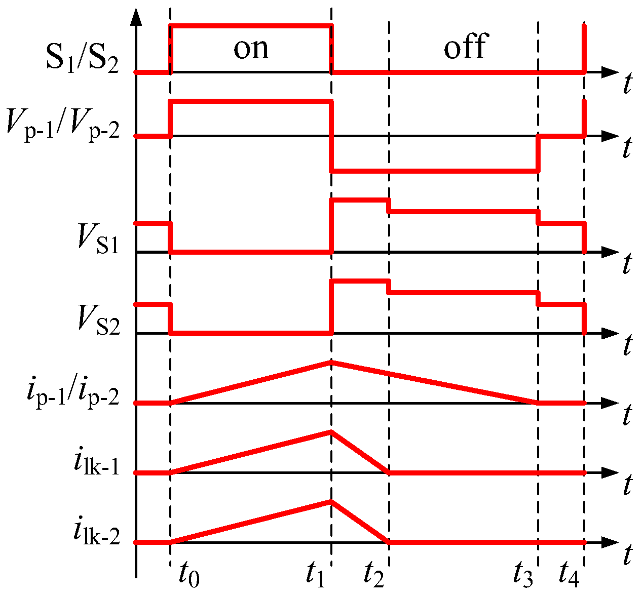 Stage 3 (t2~t3): At t2, ilk-1 = ilk-2 = 0. After t2, C1 (or C2) is still discharged through R1 (or R2), and the decrease in ip-1 (or ip-2) is continuous. In this stage, Vp-1, Vp-2, Vs-11, and Vs-12 are fixed; however, VS1 and VS2 are changed into Vi-1 + Vp-1 and Vi-2 + Vp-2, respectively.