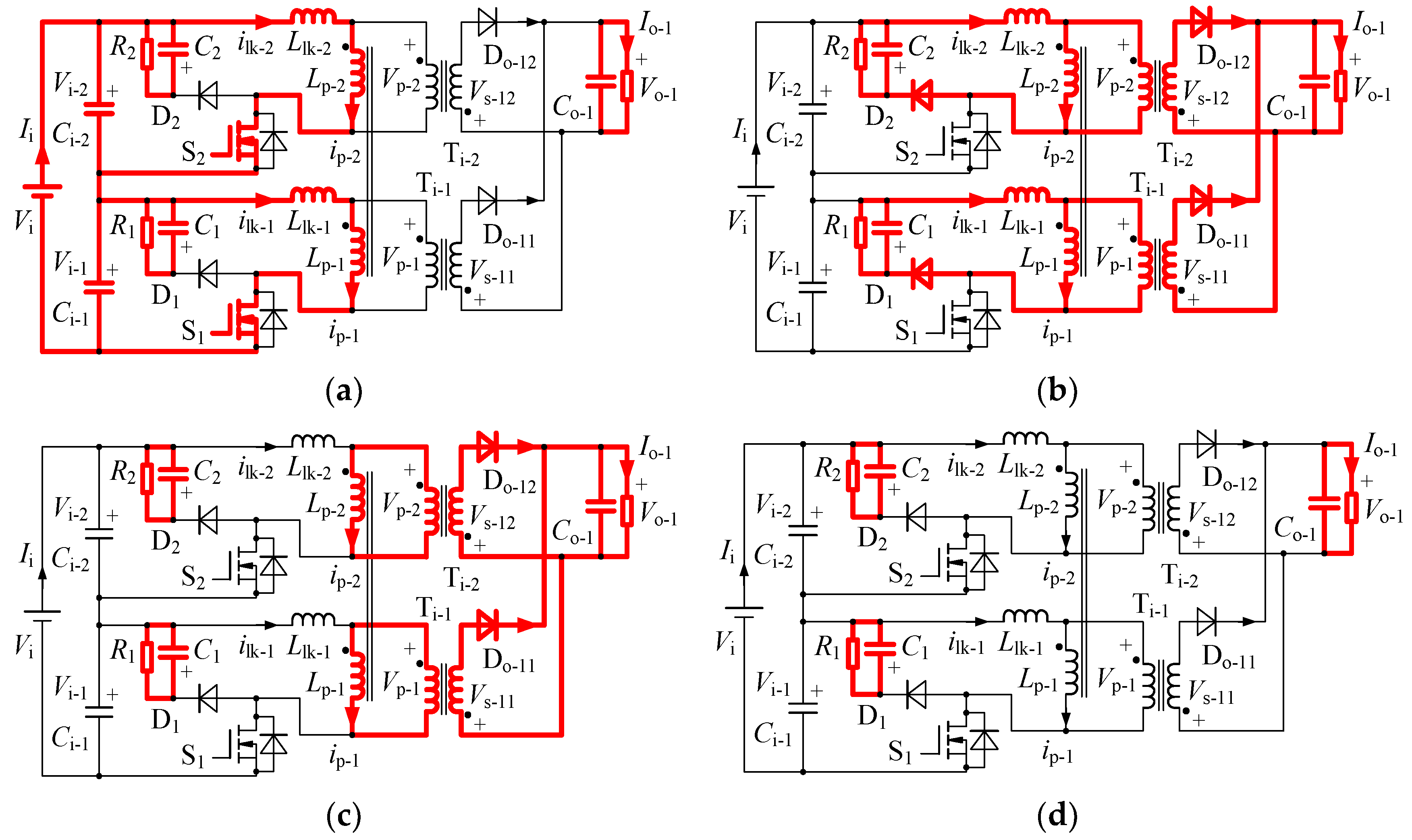 In stage 2, the energies of Llk-1 and Llk-2 are transferred into C1 and C2, respectively, so the energies stored in C1 and C2 can be affected. During the whole switching period, the maximum voltages of S1 and S2 are equal to Vi-1 + VC1 and Vi-2 + VC2, respectively. Therefore, the voltage sharing effect of S1 and S2 can also be affected, which cannot be ensured even if a good input voltage sharing effect has been achieved (Vi-1 = Vi-2 = Vi/2).