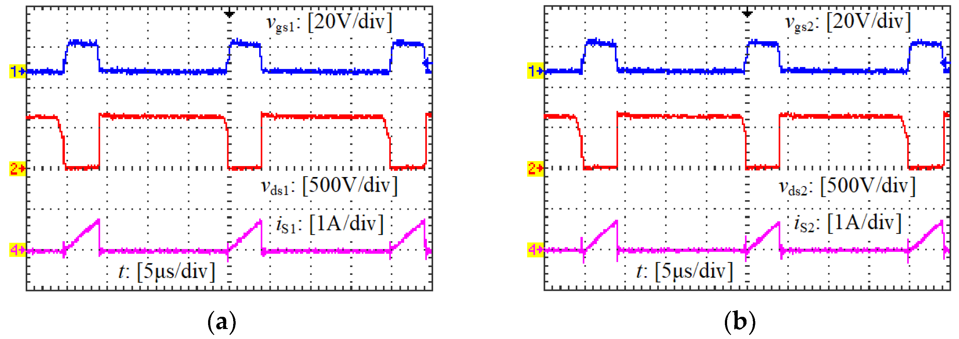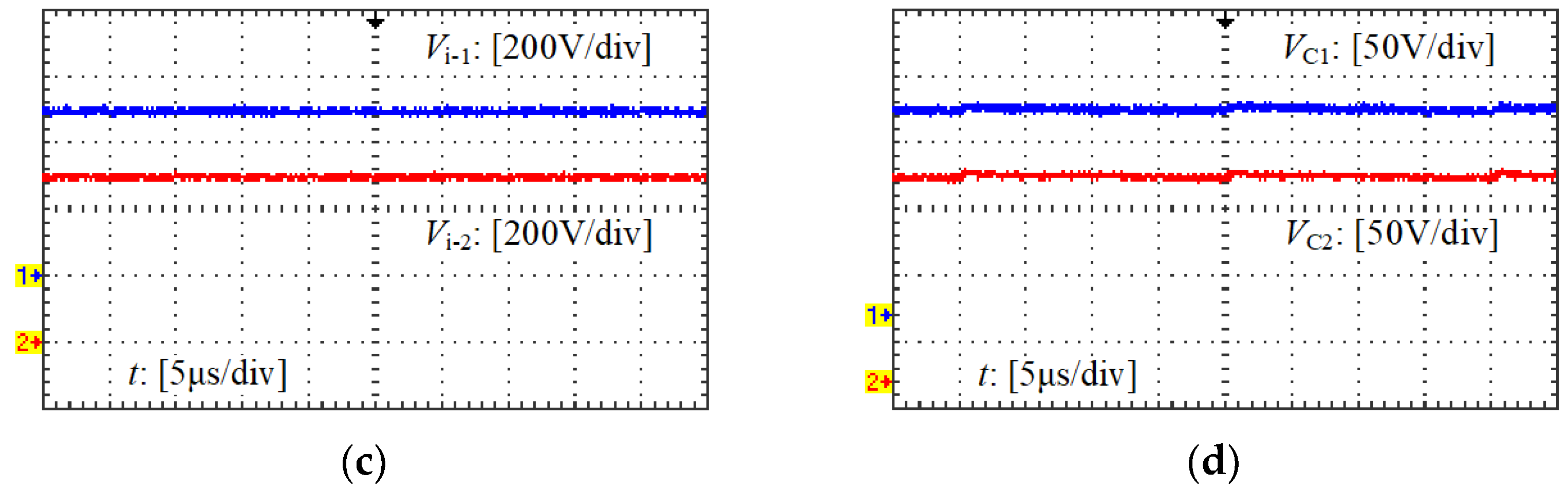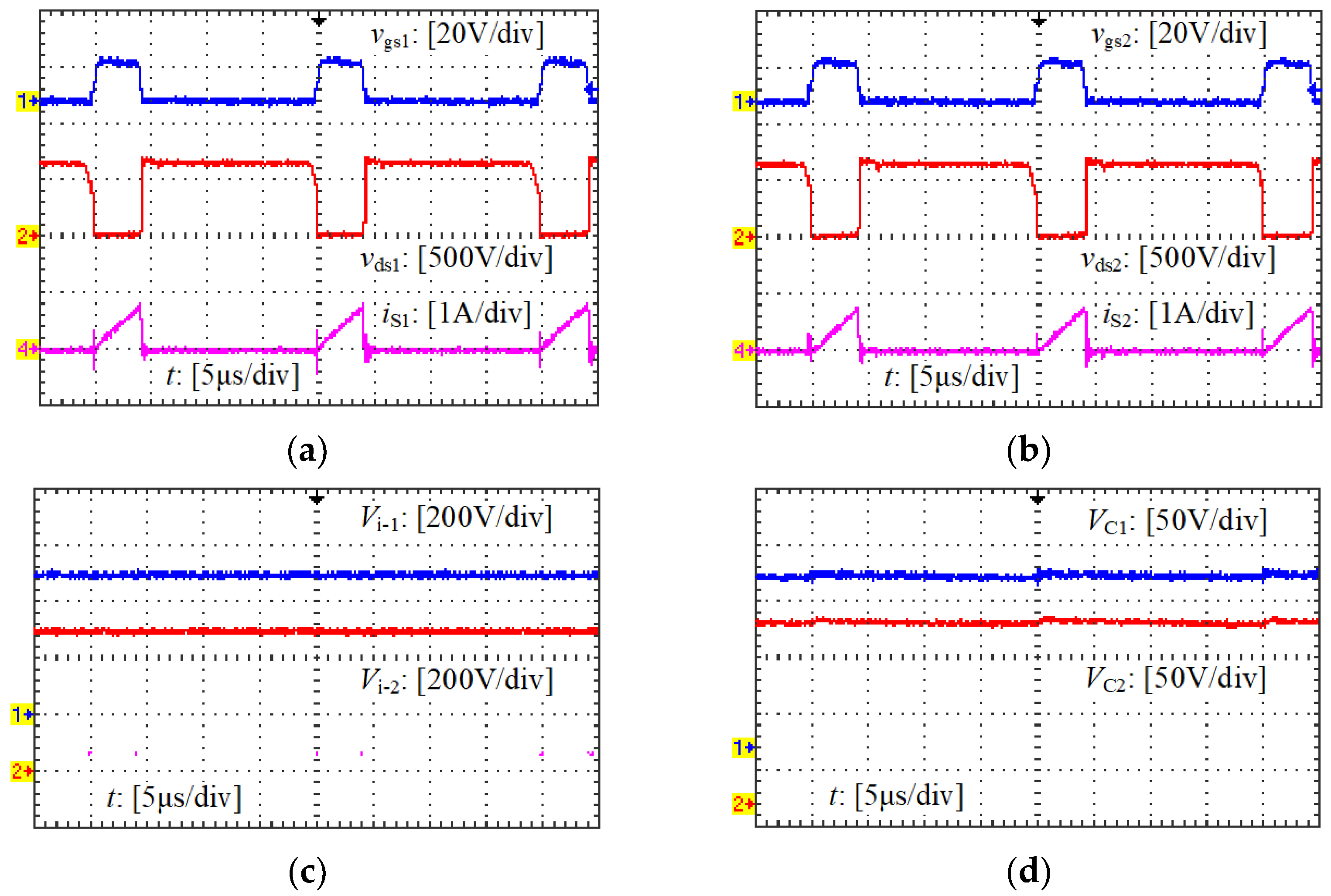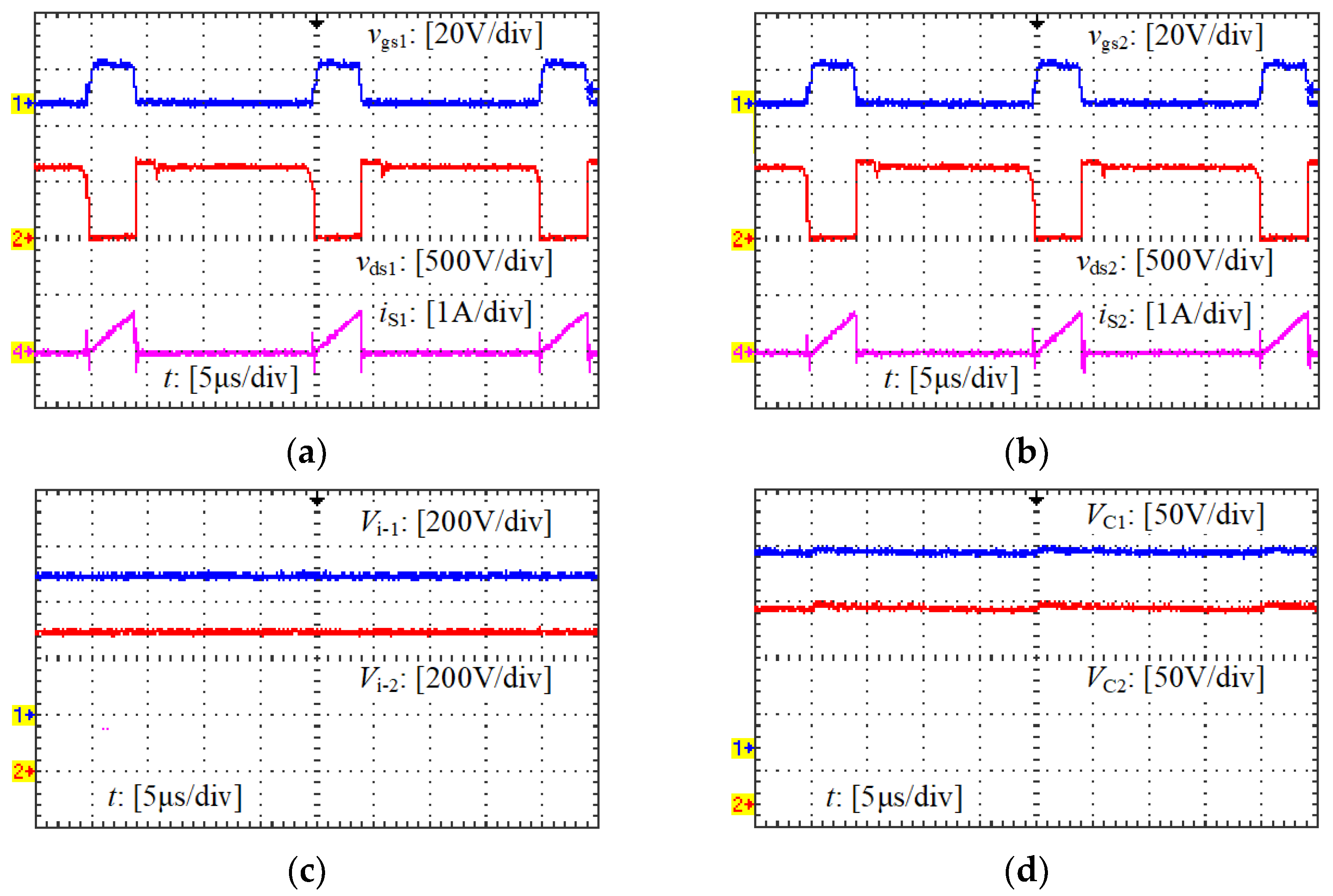 (1) The input voltage sharing effect of each input-series circuit has almost no relationships with Llk-1 and Llk-2; however, the voltage sharing effect of S1 and S2 can be affected by Llk-1 and Llk-2. The maximum voltages of S1 and S2 are equal to Vi-1 + VC1 and Vi-2 + VC2, respectively. When a good input voltage sharing effect is achieved (Vi-1 = Vi-2 = Vi/2), the voltage sharing effect of C1 and C2 should be specifically considered. As shown in Equation (7), VC1 and VC2 are determined by Llk-1 and Llk-2, respectively, and VC1 = VC2 can be achieved when Llk-1 = Llk-2.