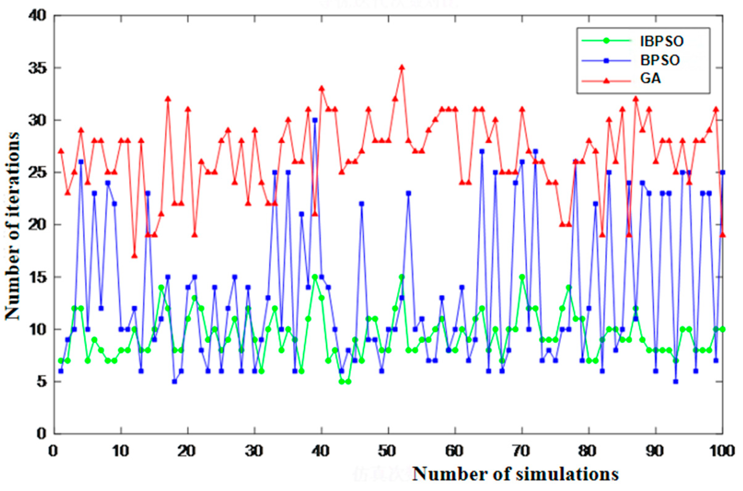 The operating parameters of GA, traditional BPSO and improved BPSO.