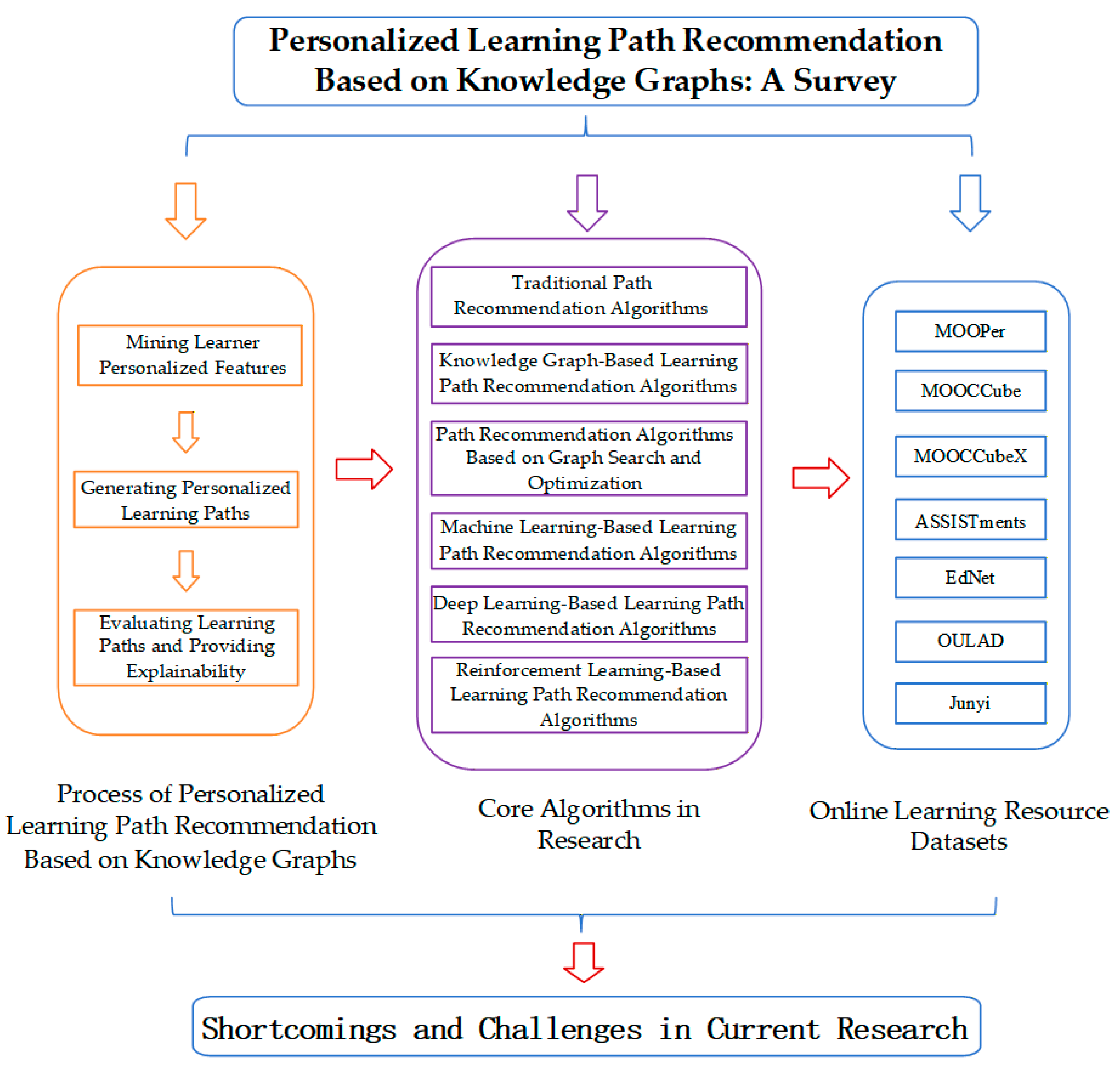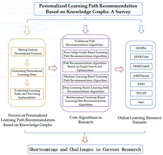 The remainder of this review is organized as follows: Section 2 elaborates on the key terms and research framework of knowledge graph-based personalized learning path recommendation; Section 3 analyzes the overall process of knowledge graph-based personalized learning path recommendation from three aspects: learner feature mining, personalized learning path generation, and path evaluation with explainability; Section 4 discusses the mainstream core algorithms in this field and their technical evolution; Section 5 summarizes typical online learning resource datasets and their application scenarios; Section 6 identifies the shortcomings and challenges existing in current research; and Section 7 provides a summary of the full paper and an outlook on future research directions.