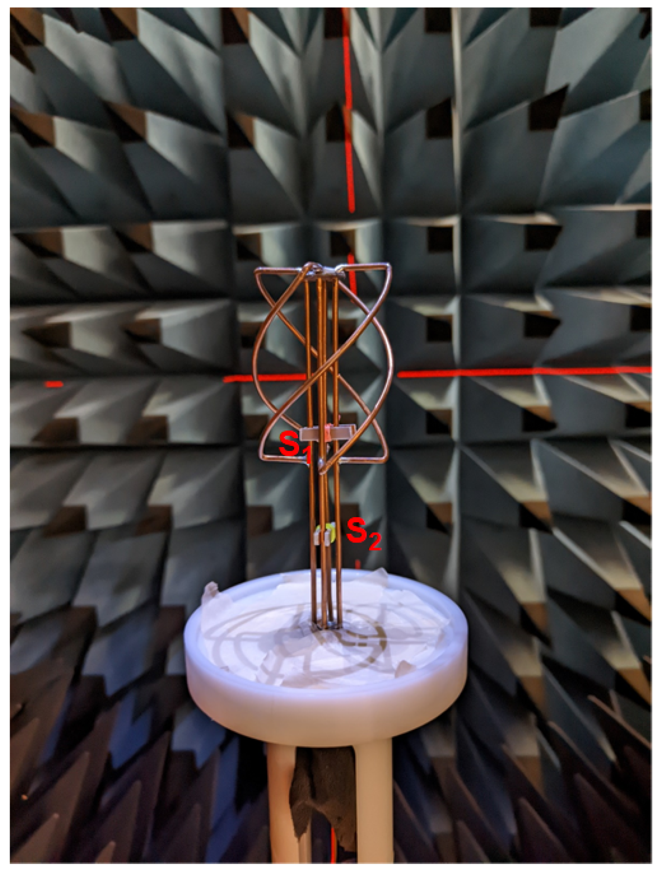 - Kilgus, C. Multielement, Fractional Turn Helices. IEEE Trans. Antennas Propag. 1968, 16, 499–500. [Google Scholar] [CrossRef]