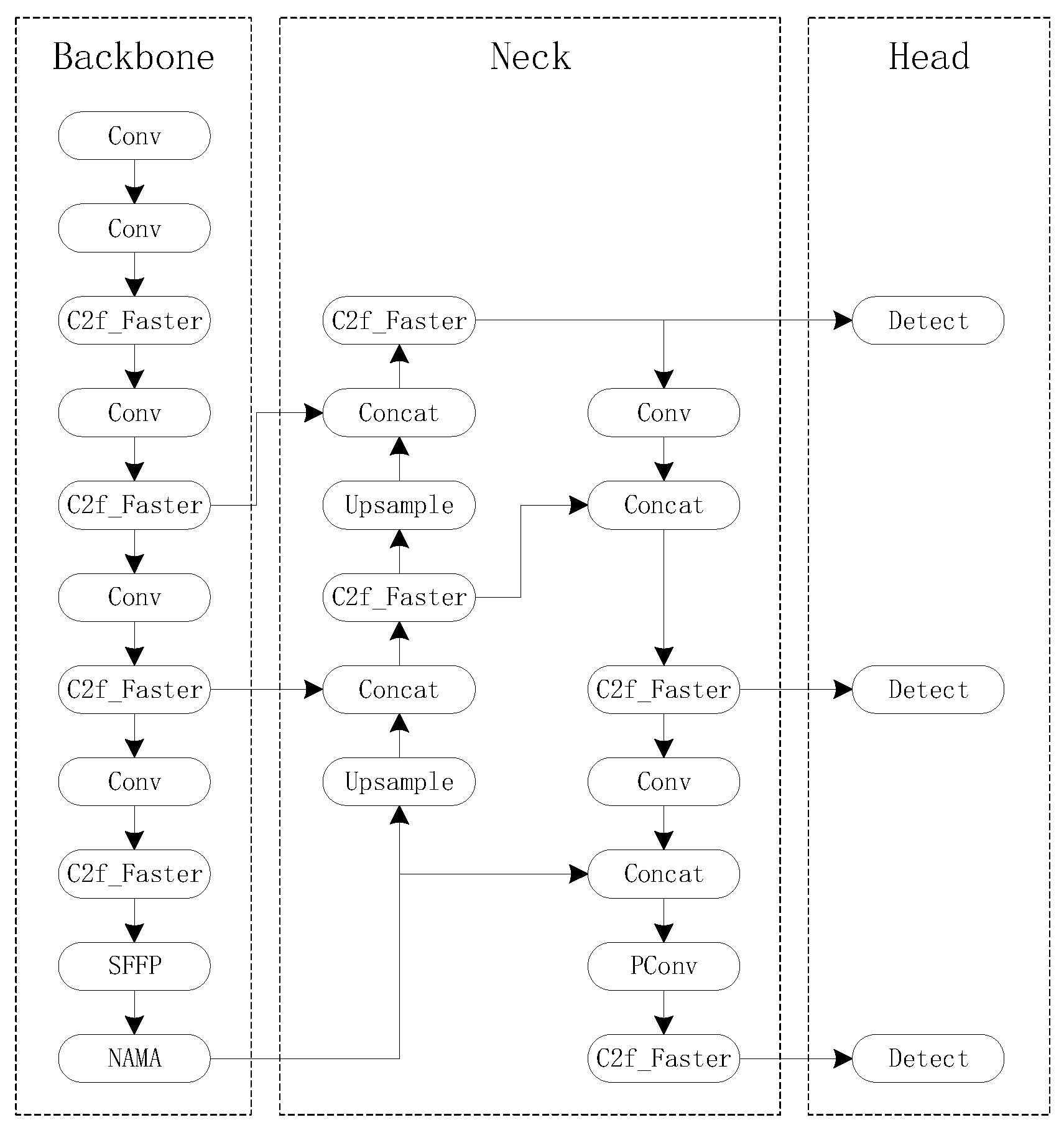 In this work, FasterNet supplants the C2f module in YOLOv8. By capitalizing on its lightweight architecture and the efficient computation proffered by PConv, FasterNet conspicuously reduces the model’s FLOPS. While upholding comparable or even enhanced detection accuracy, FasterNet curtails memory bandwidth consumption, endowing the model with the capacity to operate proficiently on embedded devices or within edge computing scenarios.