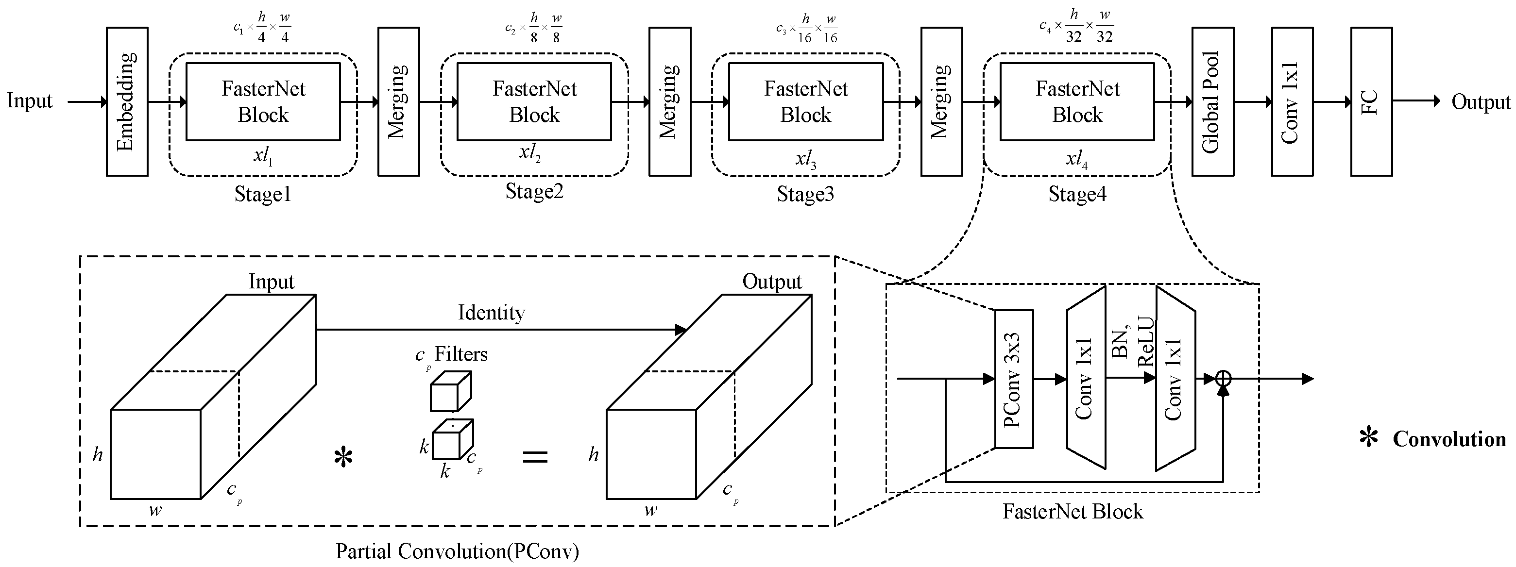When convolutional neural networks process images, they routinely engender multi-channel feature maps. These channels frequently display a high degree of similarity, and thus performing the same convolution operations across all channels can precipitate significant redundant calculations. PConv mitigates unnecessary computations by applying standard convolutions solely to a subset of the input feature map’s channels, while other channels are managed through sparse or skip connections.