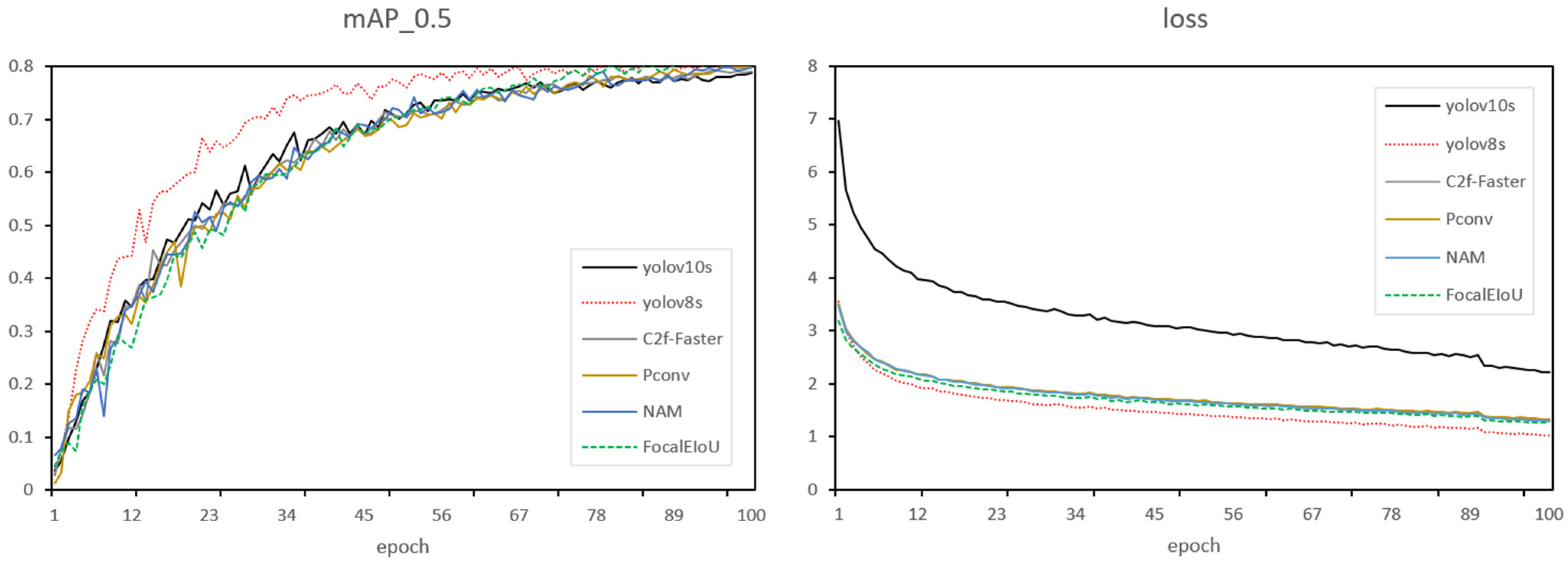 Table 2, indicate that the integration of the FasterNet module leads to a substantial reduction in the number of parameters and computational complexity. However, this comes at the cost of a slight decrease in the mean Average Precision (mAP). On the other hand, the introduction of the PConv module and the NAM attention mechanism both contribute to an improvement in mAP. The detailed comparison of mAP and loss across different models is presented in