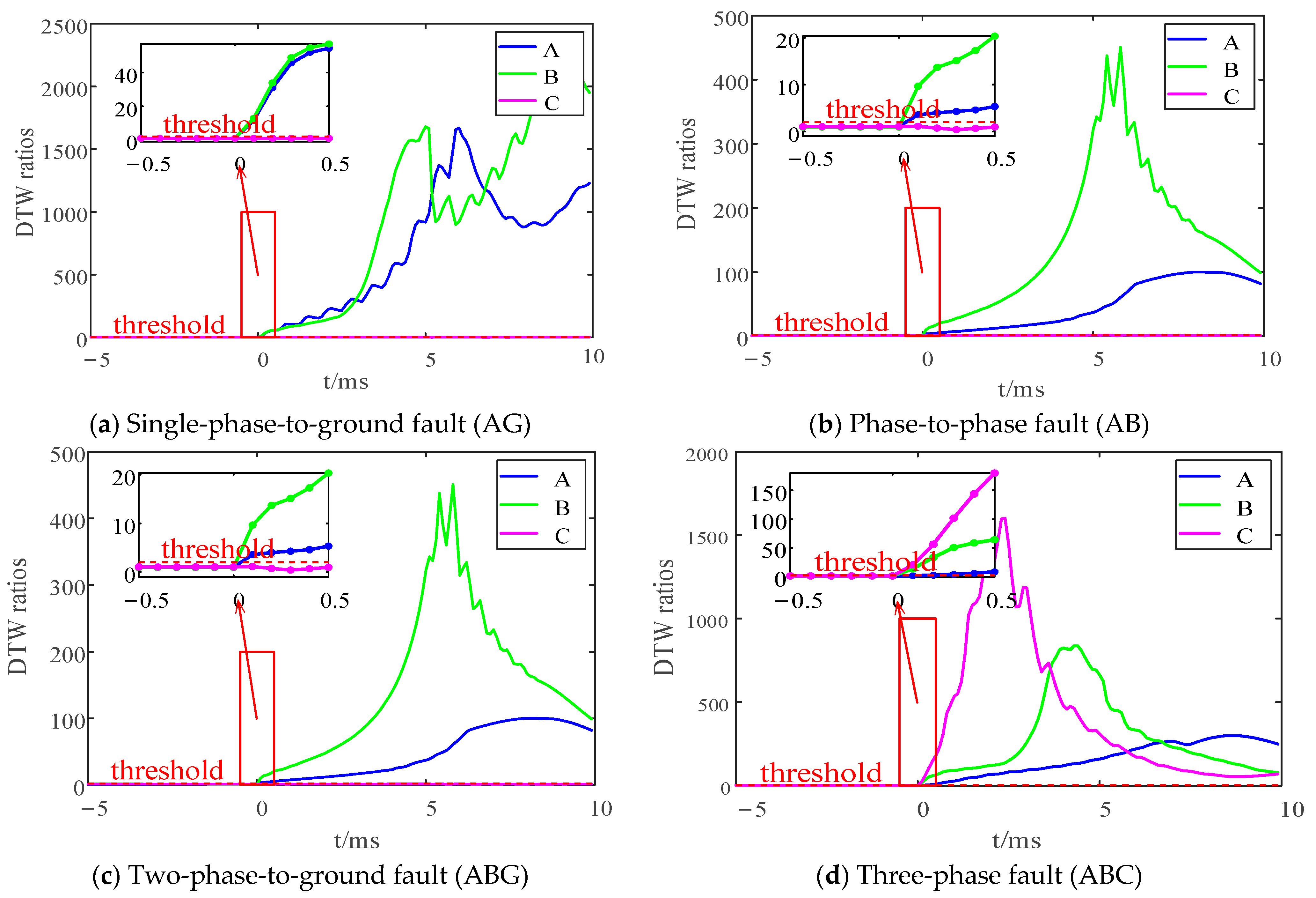 | Fault Type | Phase-A DTW Ratio | Phase-B DTW Ratio | Phase-C DTW Ratio | Protection Action |