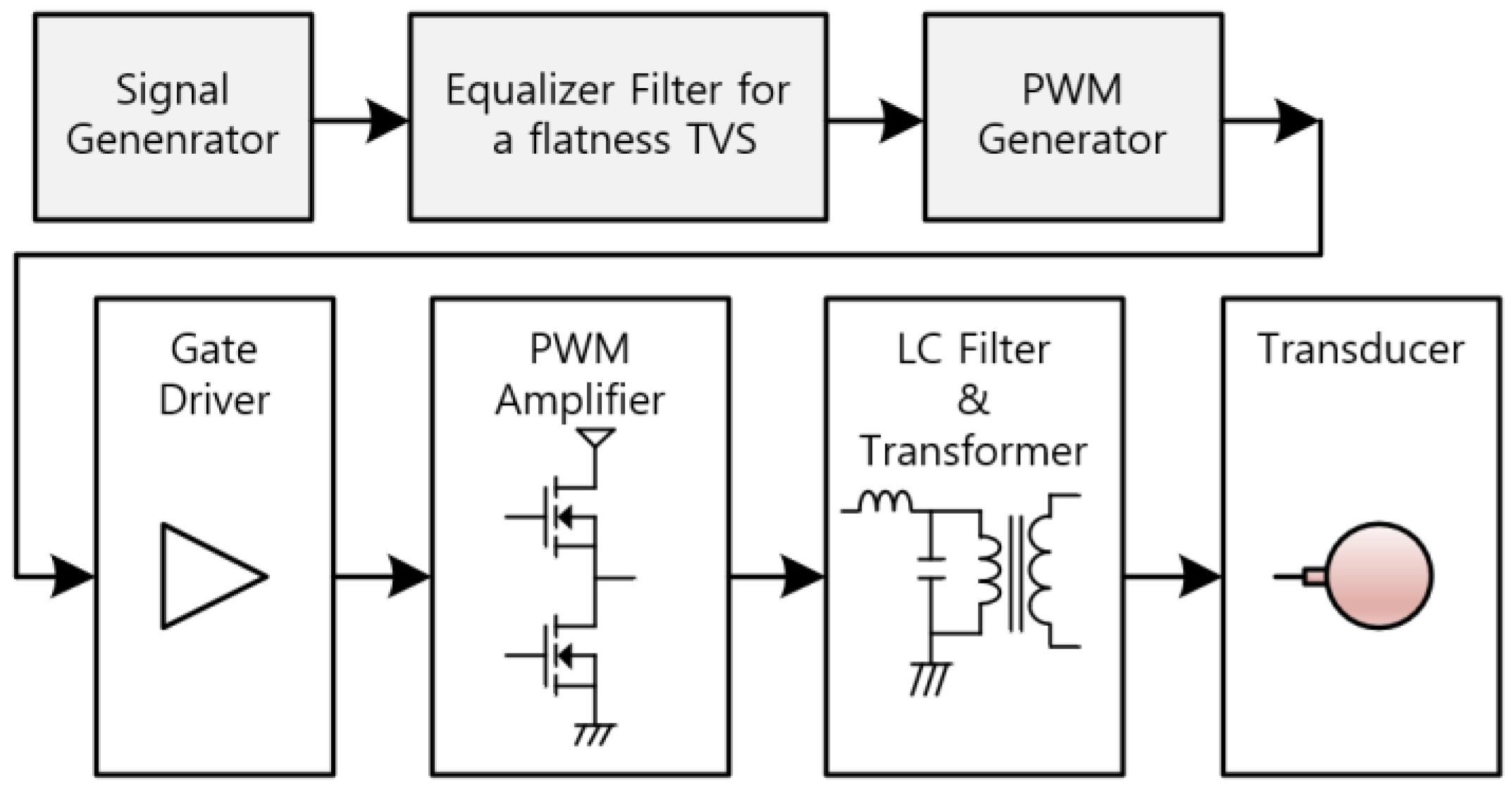 Figure 1 illustrates the configuration of the transmitter system developed in this study. Piezoelectric transducers typically produce maximum sound pressure at their resonant frequency, while output levels decrease at other frequencies. Therefore, an equalizer filter is required to ensure uniform sound pressure across the entire frequency band. In this system, the equalized signal is converted into a PWM signal, which drives the Class-D amplifier via a gate driver to generate high-power PWM output. The high-frequency switching components are removed by an LC filter, and the transmission signal is then increased through a step-up transformer before being radiated as an acoustic signal via the transducer.