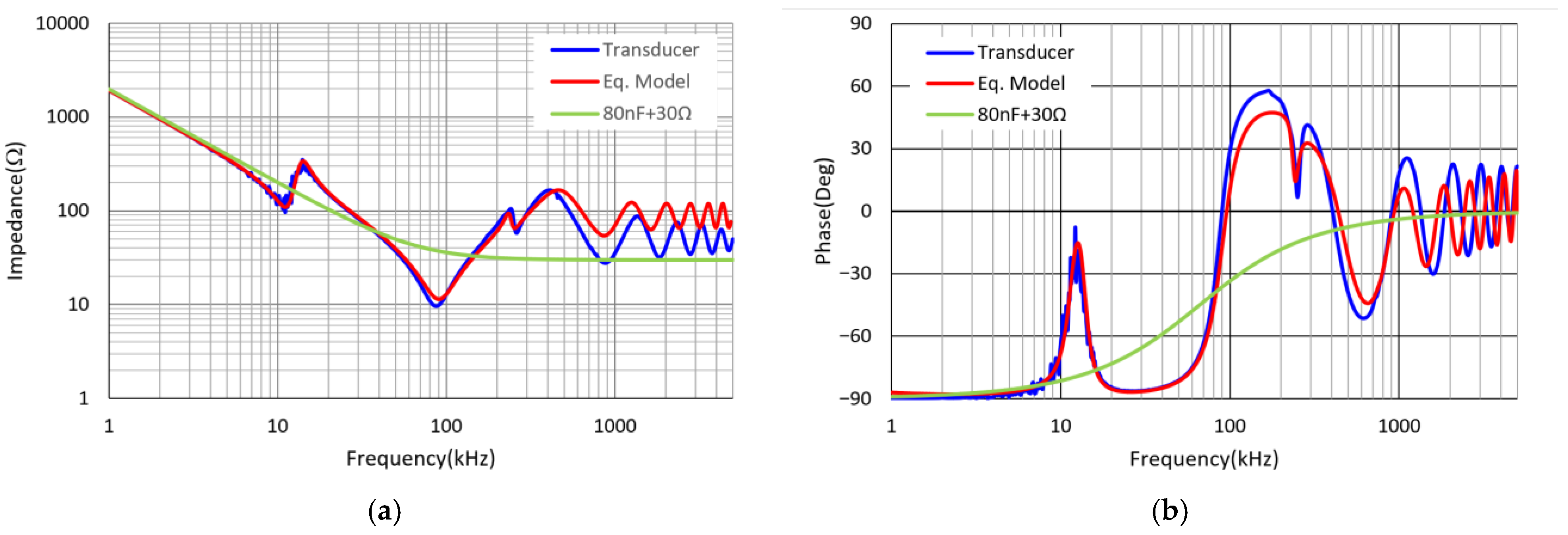 Figure 2, the impedance decreases monotonically with frequency in the range of 1 kHz to 80 kHz, except near 12 kHz. The phase remains close to −90°, indicating capacitive behavior. This region can be modeled as an 80 nF capacitor. At frequencies above 100 kHz, the impedance drops approximately to 30 Ω, and the phase approaches 0°, suggesting resistive behavior. Therefore, the transducer can be simply modeled as a series combination of an 80 nF capacitor and a 30 Ω resistor, as represented by the green line in