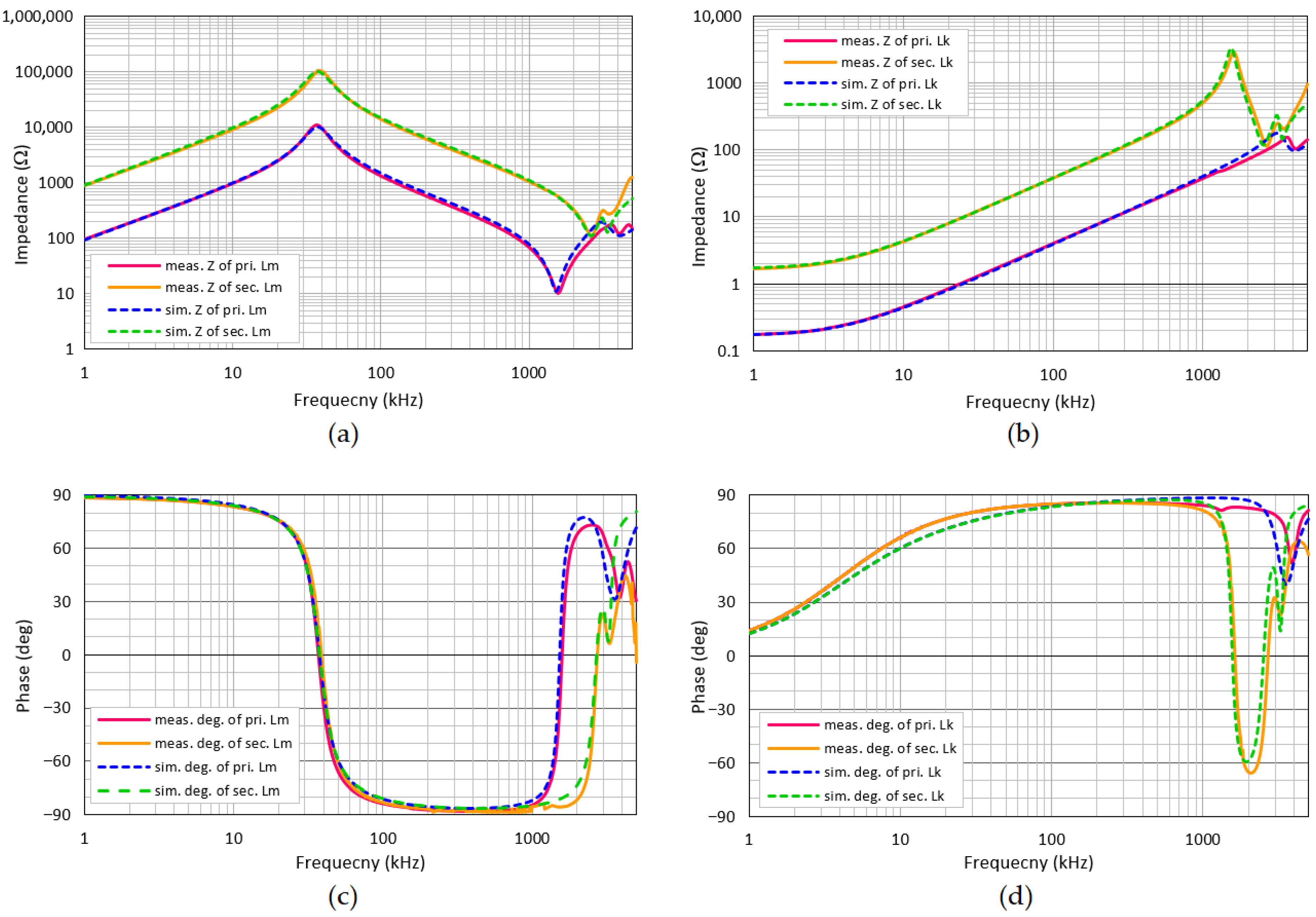Figure 6 show the measured impedance and phase characteristics of both the magnetizing and leakage inductances, and the dotted lines in