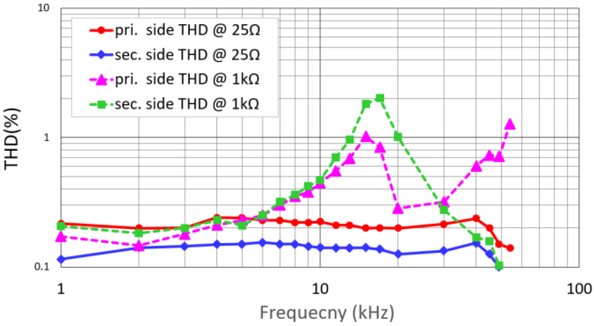 Figure 9, the THD exceeds 1% on the primary side of the step-up transformer in the frequency range around 45 kHz to 50 kHz, while on the secondary side, it surpasses 1% in the range of 10 kHz to 15 kHz.