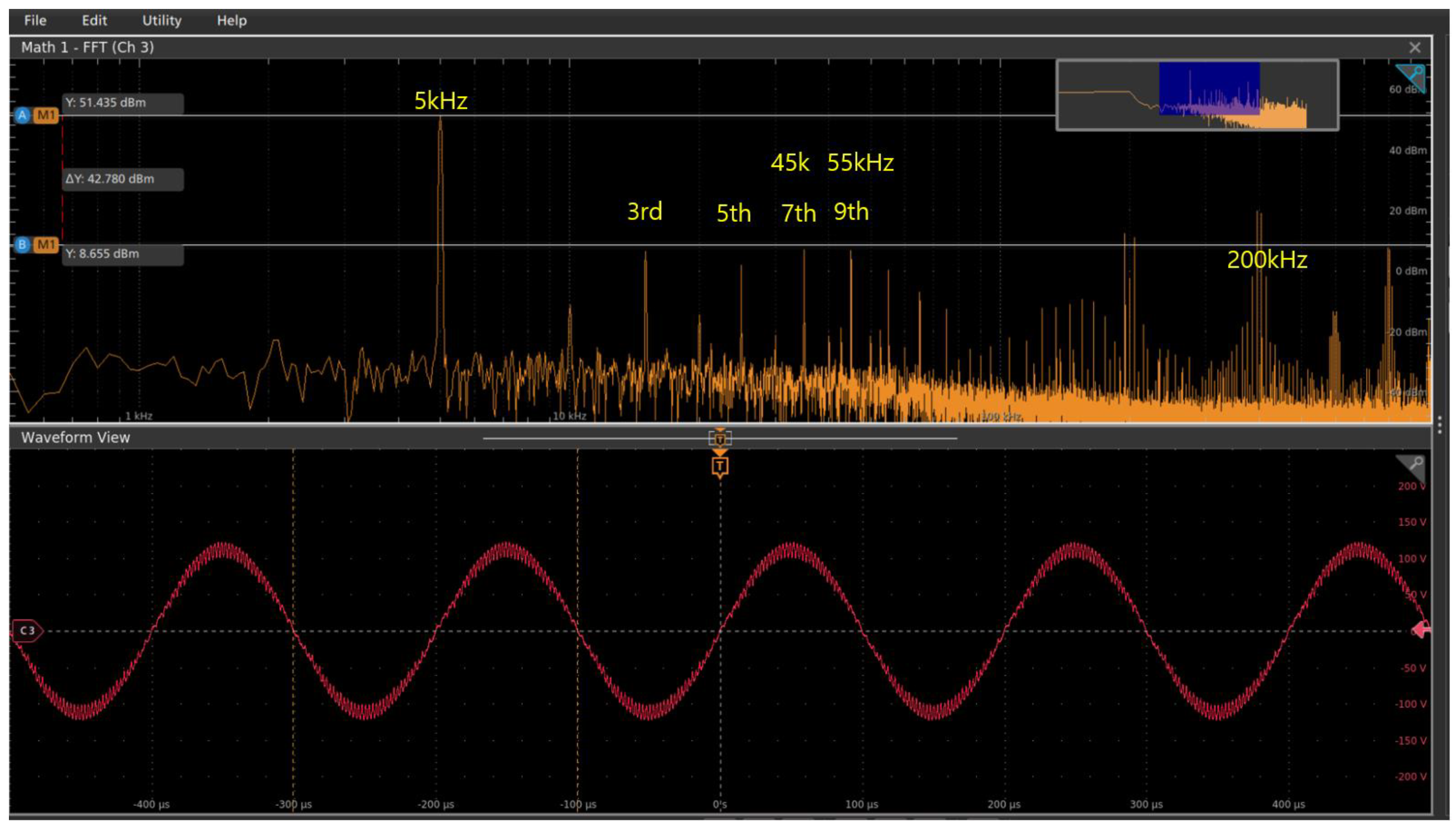 Figure 12 presents the fast Fourier transform (FFT) result of a 5 kHz signal. Although harmonic amplitudes typically decrease as the harmonic order increases, the 7th and 9th harmonics—located near the 50 kHz region—appear larger than the 5th harmonic due to the gain boosting effect around that frequency.
