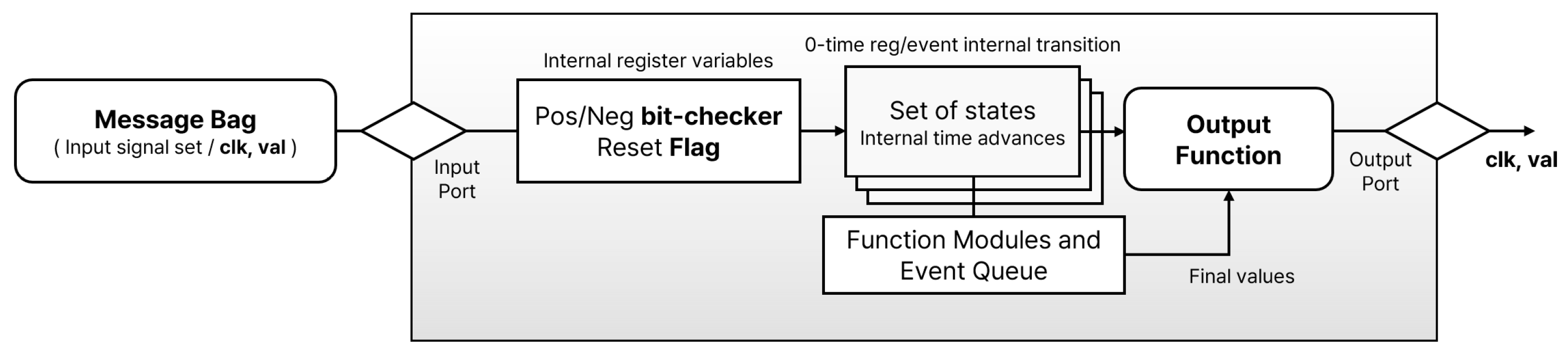 | NBA | Event parking and commit | Preserves concurrent inputs from multiple senders by holding RHS values in queues, then performs simultaneous LHS commits, mimicking the non-blocking assignment semantics of HDL. |