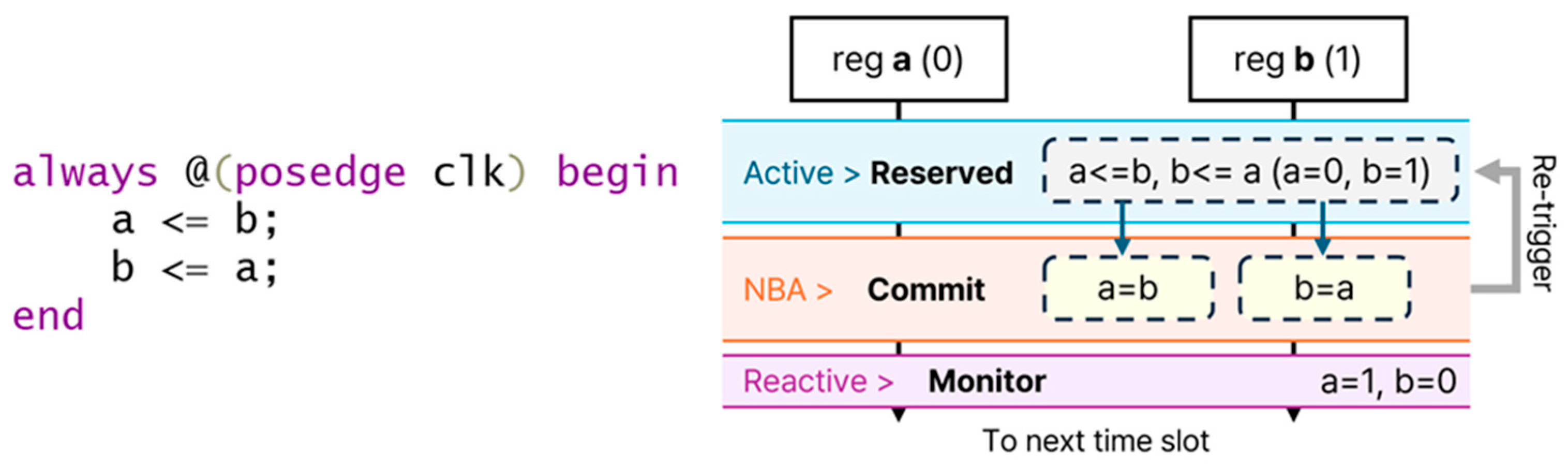 - NBA phase: The non-blocking assignments scheduled in the Active phase are applied in a single batch, causing all related signals to update simultaneously. This mechanism realizes the concurrent-update semantics of hardware.