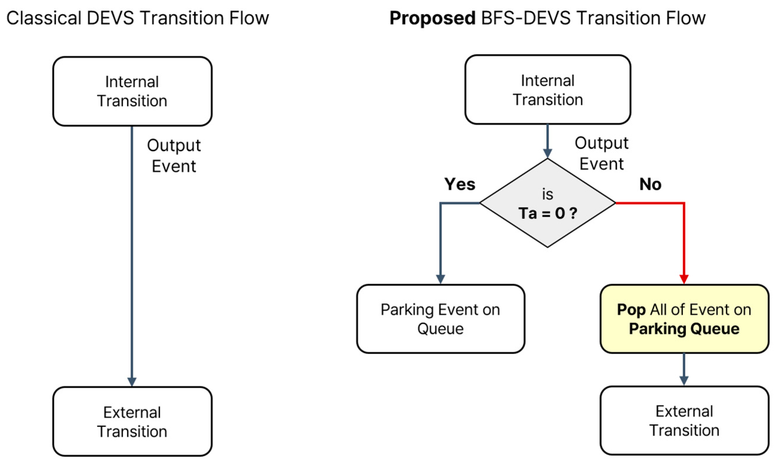 | Event-processing scheme | Active–NBA–Reactive (delta-cycle) | Internal/External/Confluent transition |