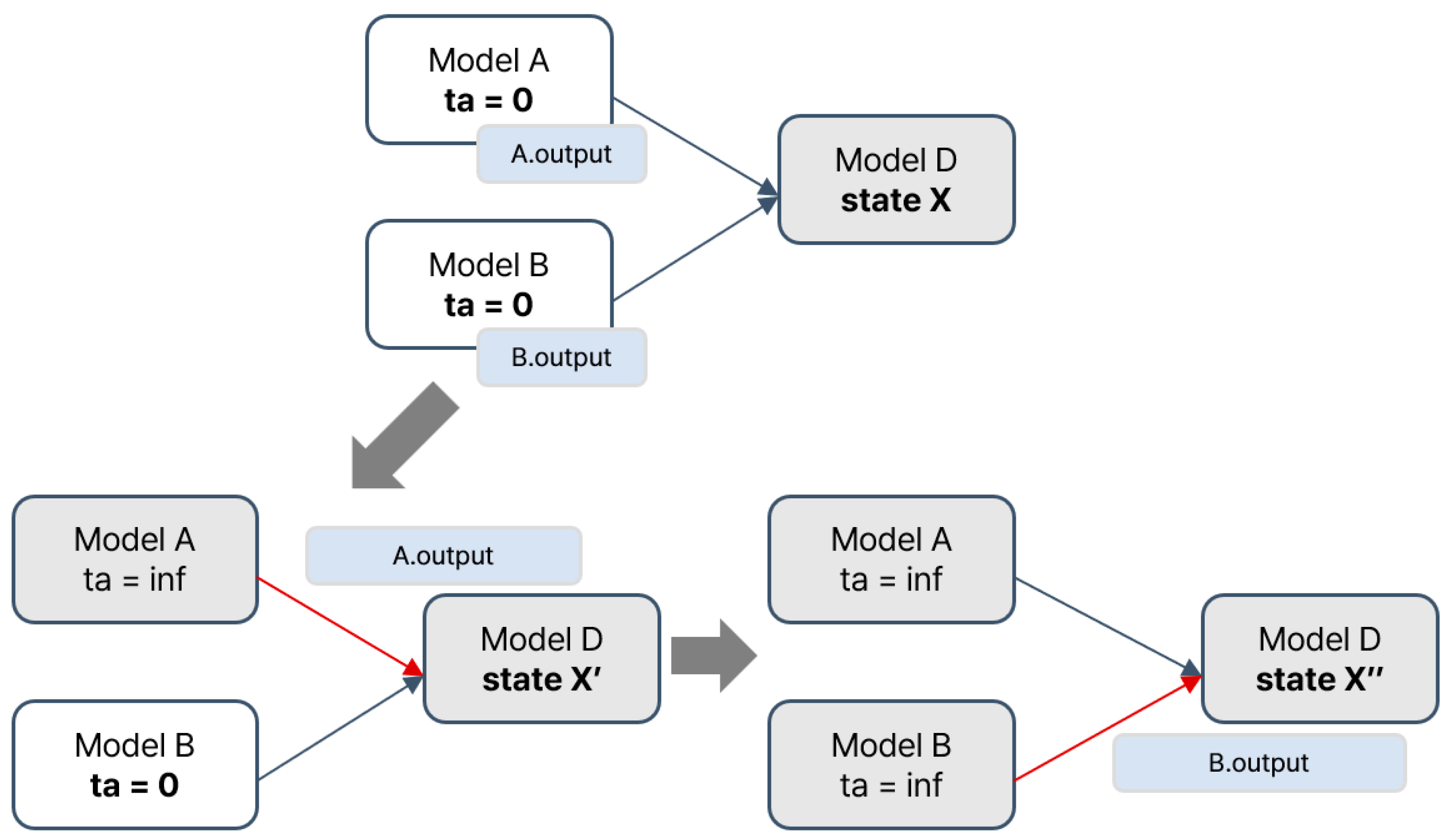 | Reactive | Delta-round detection | After commit, recalculates the new state and next event time for each model. Depending on slot conditions, either proceeds with another delta-cycle or terminates the slot and updates simulator outputs. |