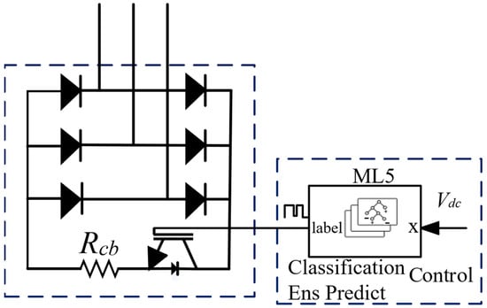 The structure of an active crowbar using the ML method is given in Figure 2. The active crowbar comprises a three-phase half-wave rectifier circuit, a controllable semiconductor switching component, and a resistor. Under normal operating conditions, the active crowbar remains inactive. During a grid fault, the active crowbar remains active. An ML algorithm has been incorporated into the control system of the active crowbar. The input to the ML algorithm is Vdc, which is continuously measured. The active crowbar sends a switching signal to the gate of a controllable semiconductor switching component based on the measured value. When a fault occurs in a power grid, the overvoltage generated in the WECS system is converted to heat through the resistor and safely discharged. A conventional crowbar remains permanently active, causing energy loss. However, an active crowbar is activated and deactivated in a controlled manner. After a grid fault, the parameters of a WT return to normal values, and an active crowbar is deactivated. The wind turbine continues to generate normal power and remains connected to the grid. An active crowbar resistor of 0.4 Ω, an anti-parallel diode rated at 3 kV/800 A, and a high-power IGBT rated at 2.5 kV/800 A are selected in this study due to the fact that the DC-link voltage level reaches approximately 2000 V during a grid fault.