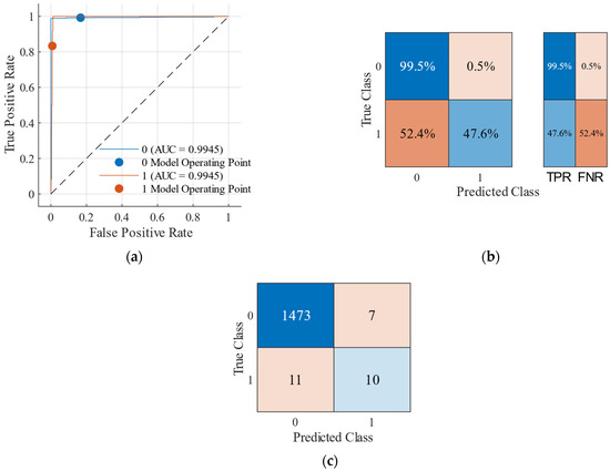 Performance evaluation of the classification model using an ensemble boosted tree: (a) receiver operating characteristic, (b) true-positive and false-negative rate comparison, and (c) distribution of sample counts.