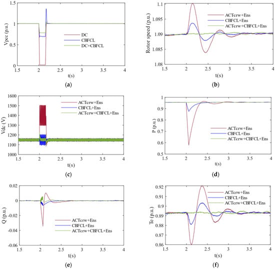 Figure 7 illustrates the dynamic responses of a 1.5 MVA WT-based PMSG system during a single-phase asymmetrical grid fault, employing ACTcrw, CBFCL, and ACTcrw + CBFCL. The fault lasts for 150 ms in this study. A single-phase asymmetrical grid fault is introduced at t = 2.0 s and is cleared at t = 2.15 s.