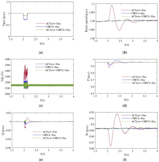 Figure 6 illustrates the dynamic responses of a 1.5 MVA WT-based PMSG system during a two-phase asymmetrical grid fault, employing ACTcrw, CBFCL, and ACTcrw + CBFCL. The fault lasts for 150 ms in this study. A two-phase asymmetrical grid fault is introduced at t = 2.0 s and is cleared at t = 2.15 s.